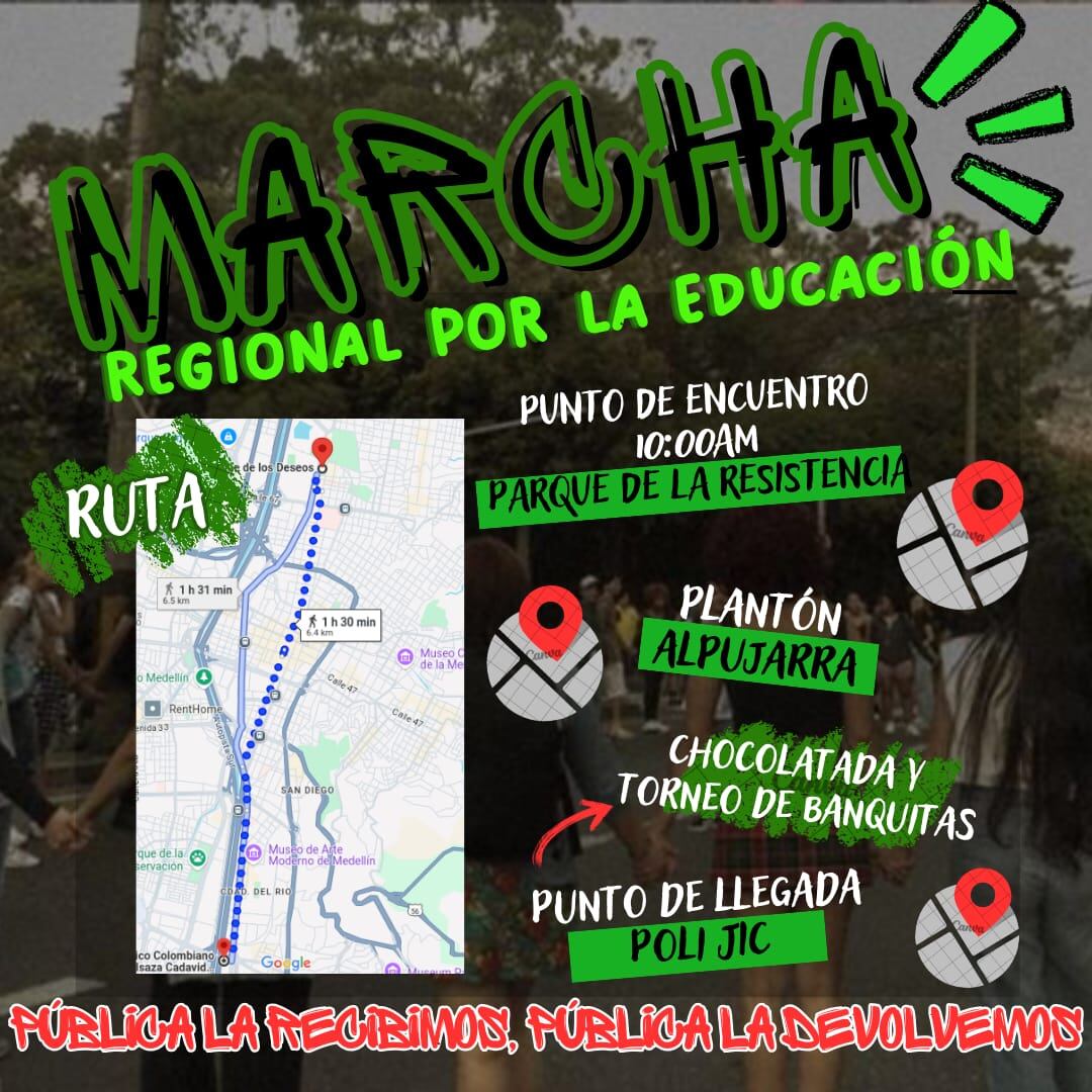 La concentración de la marcha está pactada para las 10 de la mañana, y el recorrido inicia desde el Parque de los Deseos, contiguo a la UdeA; partirá hacia la estación Prado del Metro, luego llegará al Centro Administrativo La Alpujarra donde se realizará un plantón. Posteriormente continuarán por la avenida El Poblado y finalizarán en el Politécnico Jaime Isaza Cadavid.