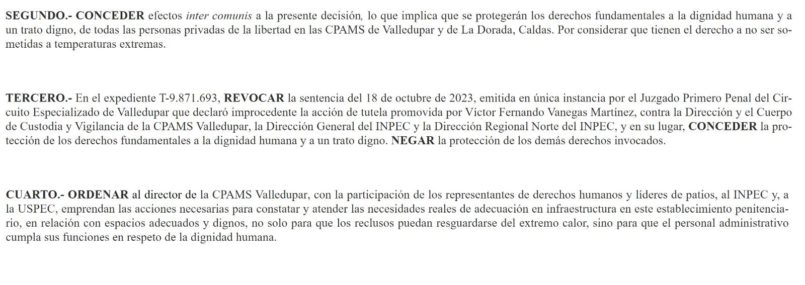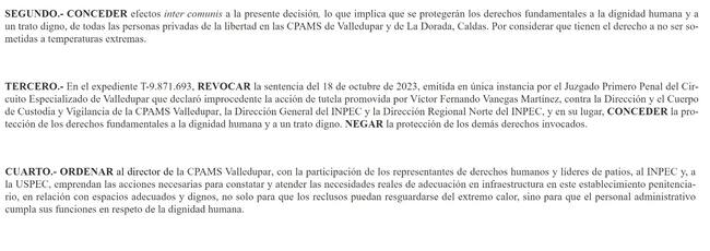 Cabe resaltar que en ese fallo de tutela también se le hizo un llamado a la cárcel Doña Juana de la Dorada Caldas para verificar las condiciones en las que se encuentran las personas privadas de la libertad por condiciones insuficientes ventilación en las celdas, por la falta de pilas o baterías para el buen funcionamiento de los ventiladores permitidos.