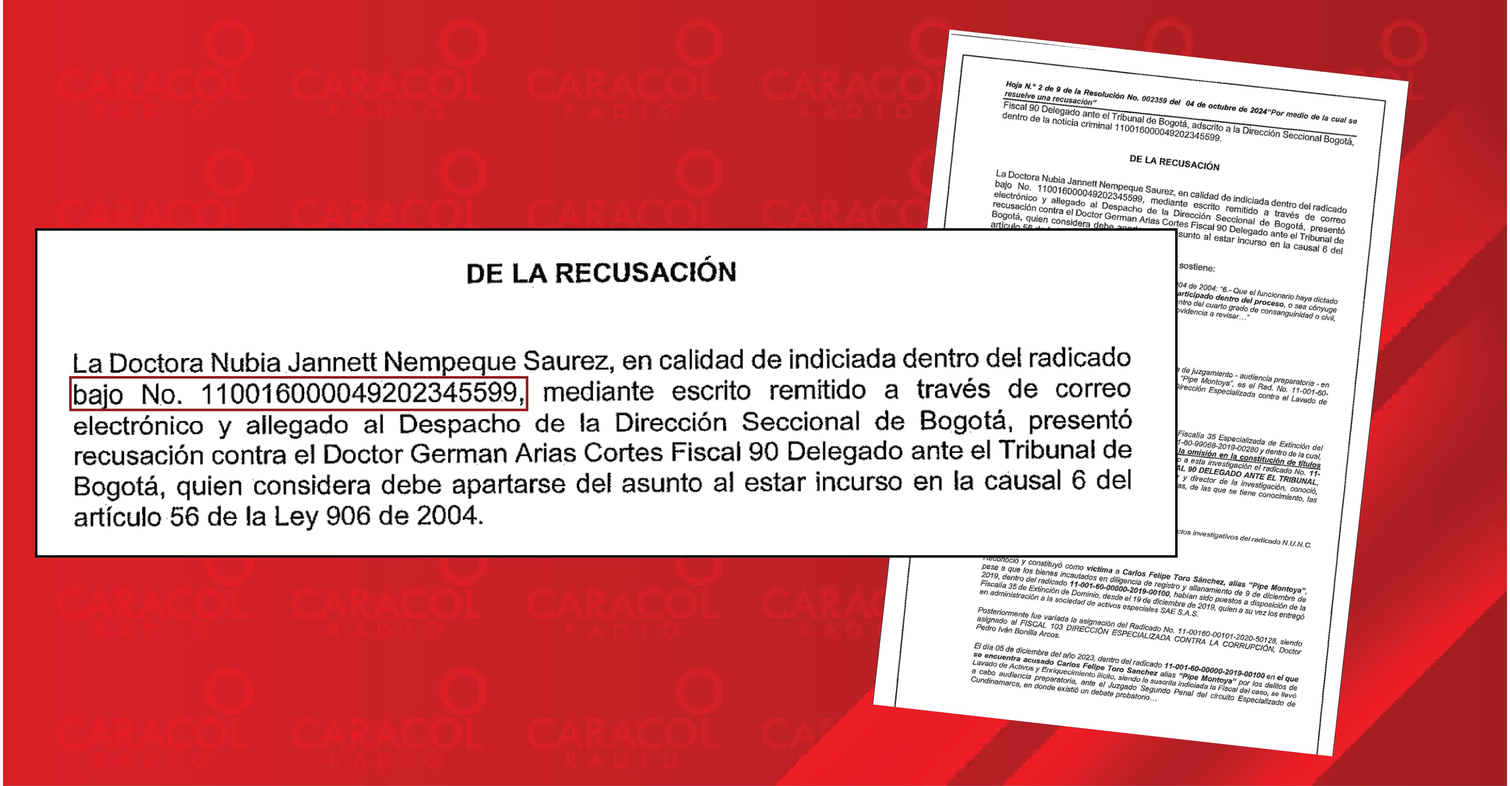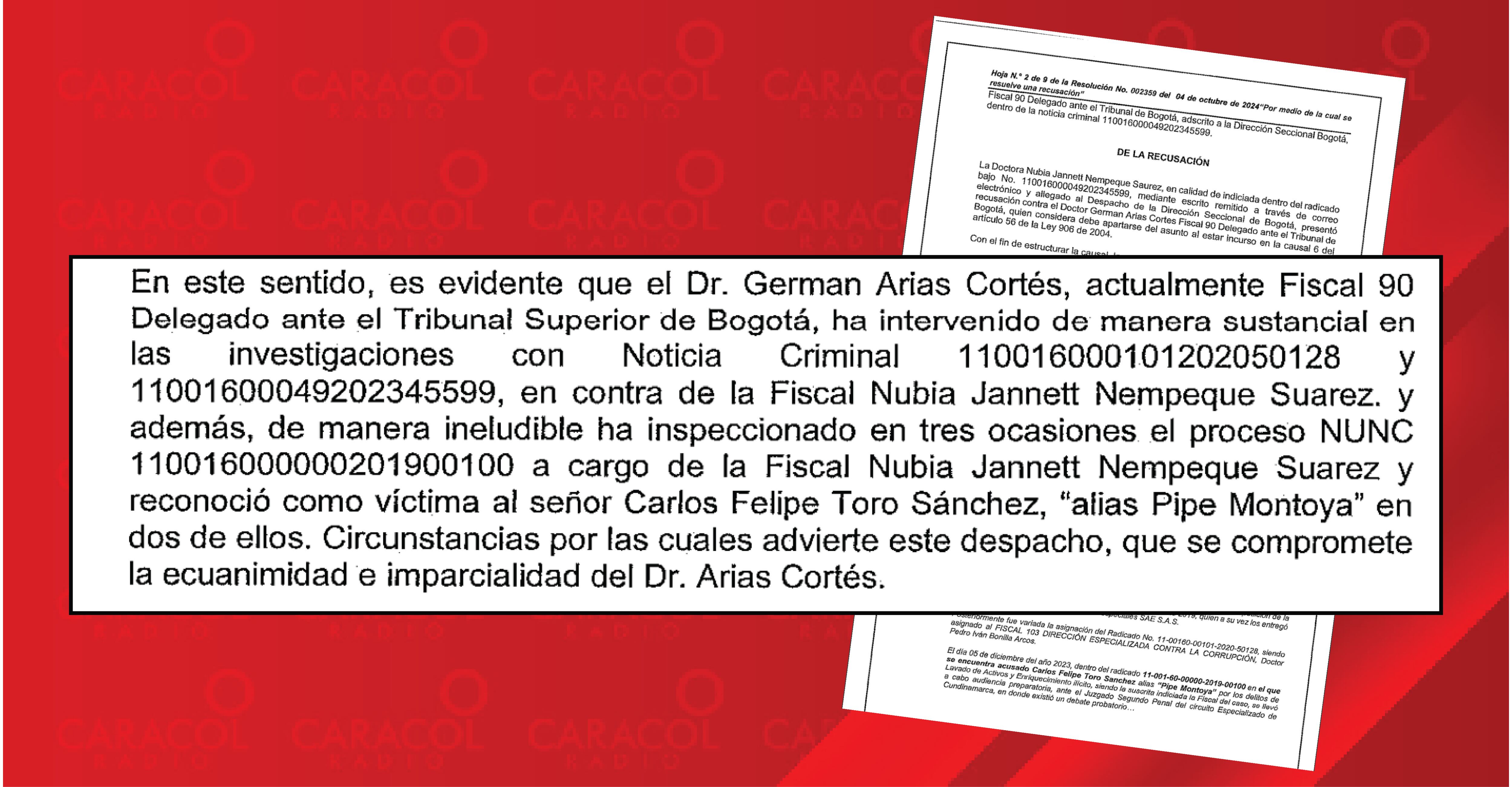 Caracol Radio conoció que la fiscal Luz Ángela Bahamón, por reparto, le correspondió asumir el proceso que se sigue en contra de la fiscal de Lavado de Activos Nubia Nempeque, investigada por supuestamente tratar de engañar a una juez Especializada en el juicio que se sigue contra el antiguo narco alias ‘Pipe Montya’.