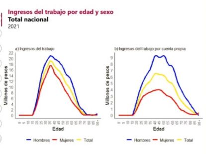 Además, los hombres empleados por cuenta propia ganan un máximo de $9,3 millones a los 42 años, mientras que las mujeres a los 45 años, ganan máximo un monto de $4 millones. Esto genera una brecha de casi el 57% en ingresos entre hombres y mujeres.