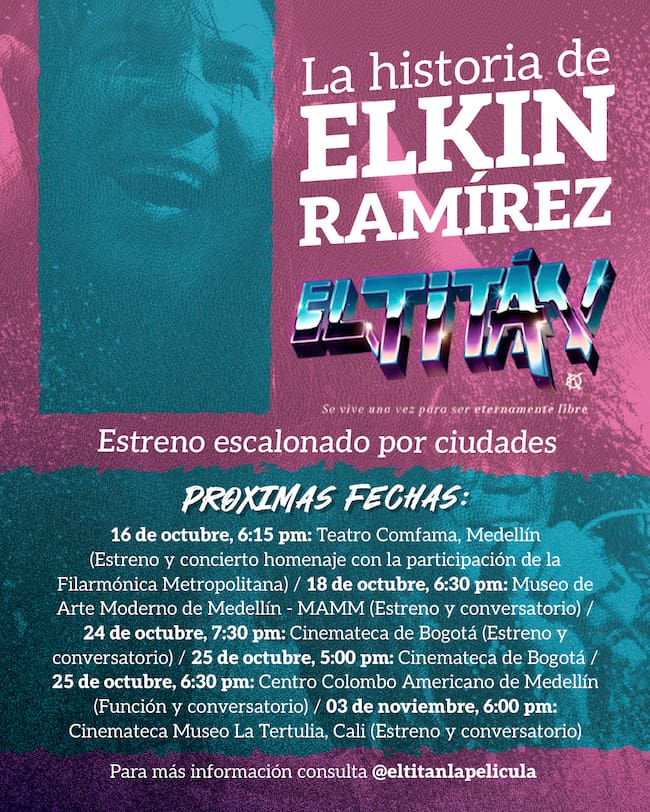 El documental “El Titán”, que narra la vida y legado de Elkin Ramírez, líder de la banda de rock Kraken, tendrá su estreno en Medellín el 16 de octubre en el Teatro Comfama a las 6:15 p. m. y el 24, del mismo mes, en la Cinemateca Distrital de Bogotá. Este evento, titulado “El Titán y la Filarmónica: Una noche para la historia”, contará con la participación de la Orquesta Filarmónica Metropolitana de Medellín, que interpretará algunos de los clásicos de Kraken antes de la proyección del filme. Adicionalmente, algunas funciones irán acompañadas de conversatorios, por ejemplo, las funciones del 18 y 25 de octubre en Medellín y en Cali el 2 de noviembre.