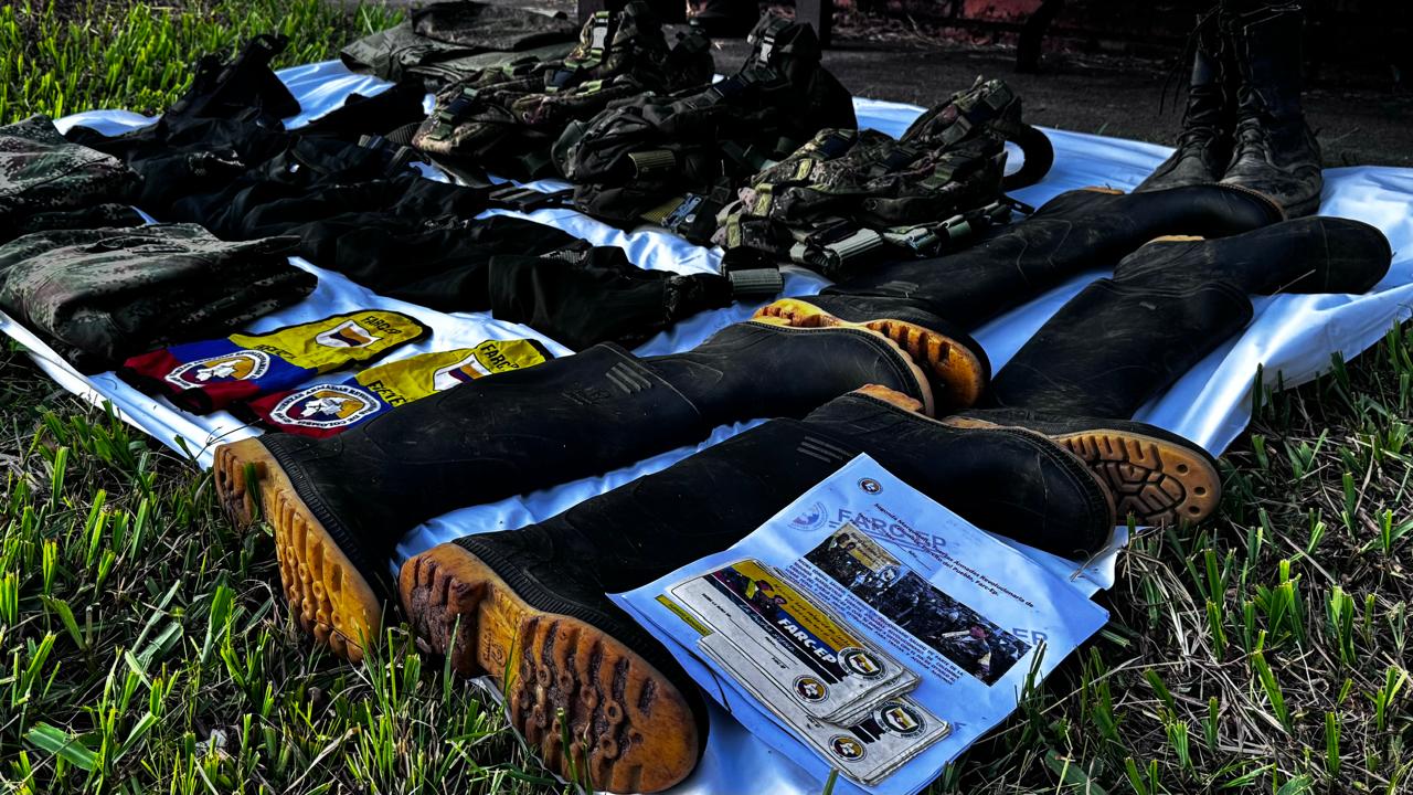 Material incautado: halladas 2 armas largas tipo fusil AK-47, un arma larga tipo fusil LCT AK, una escopeta calibre 12 milímetros, 34 cartuchos de diferentes milímetros, 6 proveedores y 2 granadas de humo, 2 radios de comunicación. Así mismo, fueron incautados uniformes de uso exclusivo de las Fuerzas Militares, botas, chalecos multipropósito y brazaletes alusivos a la estructura armada ilegal.
