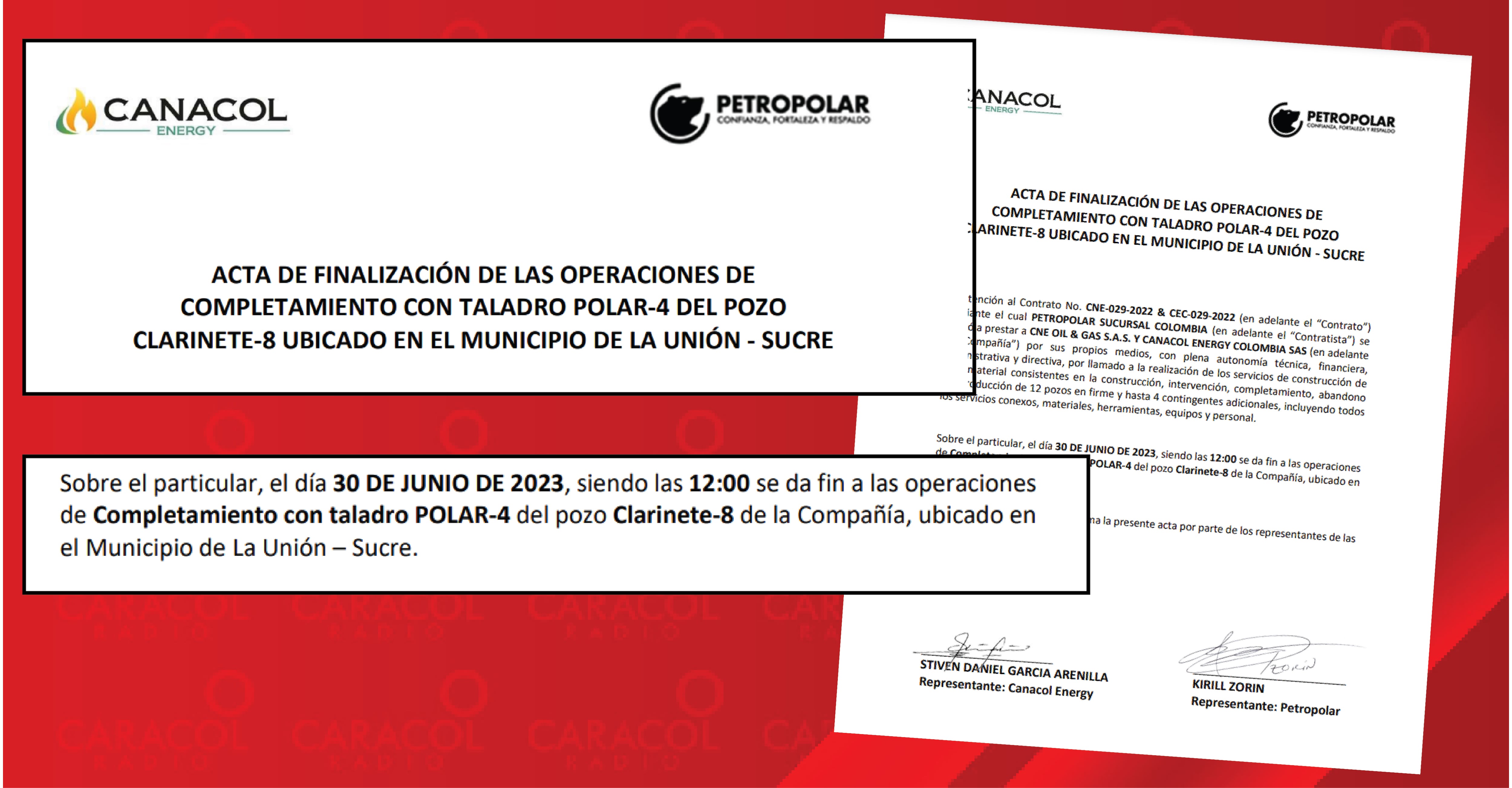 Y el acta de las operaciones de perforación del pozo “Clarinete -8″ ubicado en el municipio de La Unión, Sucre, que finalizó las tareas de operación y funcionamiento el 30 de junio de 2023. Las actas están firmadas por CANACOL ENERGY y PETROPOLAR Sucursal Colombia, ninguno de esos trabajos fue pagado a los empresarios ni a los empleados contratados. ((VER ACTA))