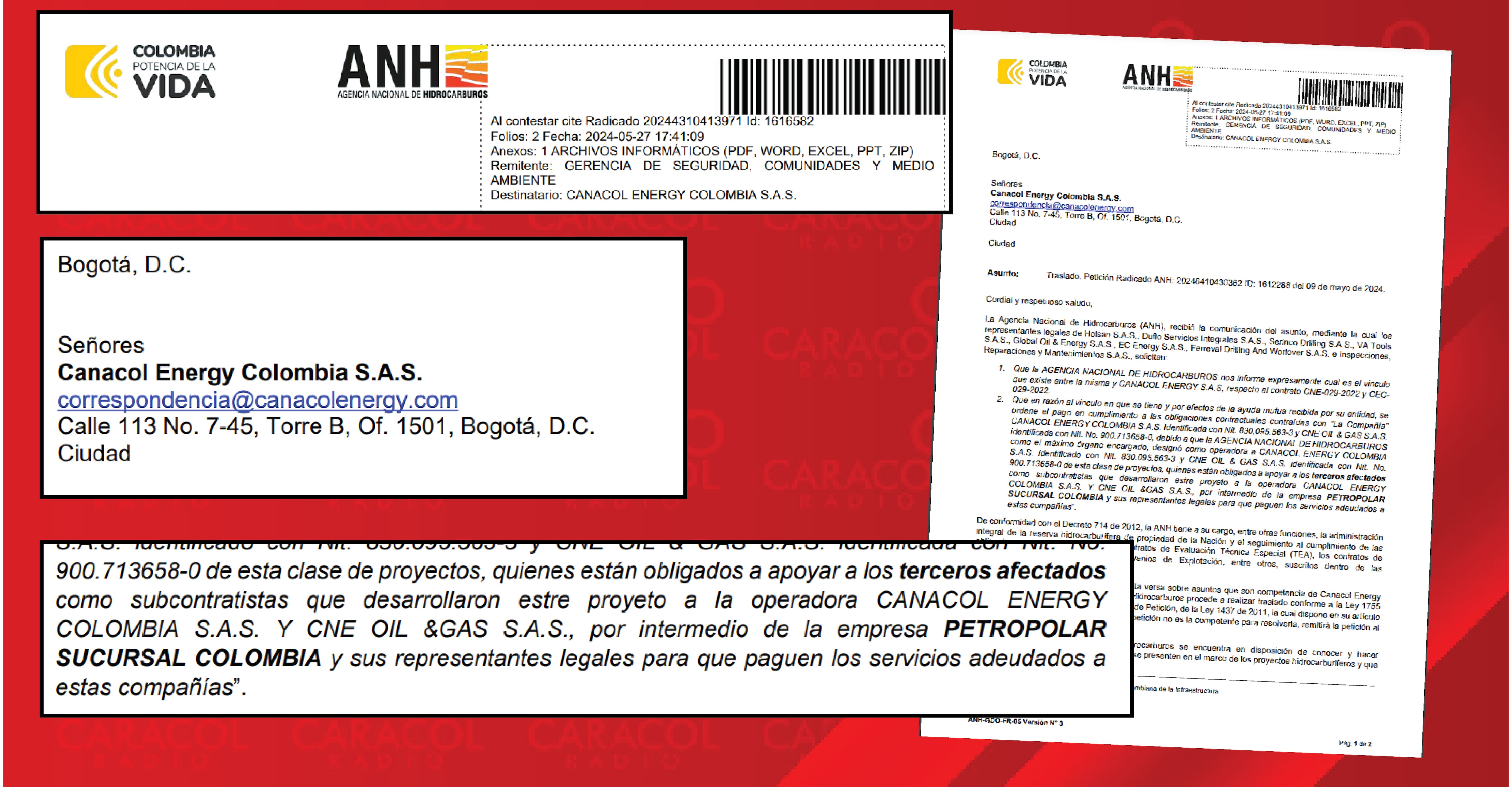 El 27 de mayo de 2024, la Agencia Nacional de Hidrocarburos remitió una carta a CANACOL Energy para que explicara cuál era el vínculo con Petropolar Sucursal Colombia y por qué no se ha pagado las obligaciones con los terceros afectados, es decir, a los empresarios a los que les hicieron “conejo”. ((VER DOCUMENTO ANH))