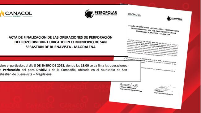 También, aparece el acta de finalización de las operaciones de perforación del pozo denominado como “Dividivi-1″ en San Sebastián de Buenavista en Magdalena. Fin de las operaciones el 8 de enero de 2023. ((VER ACTA))