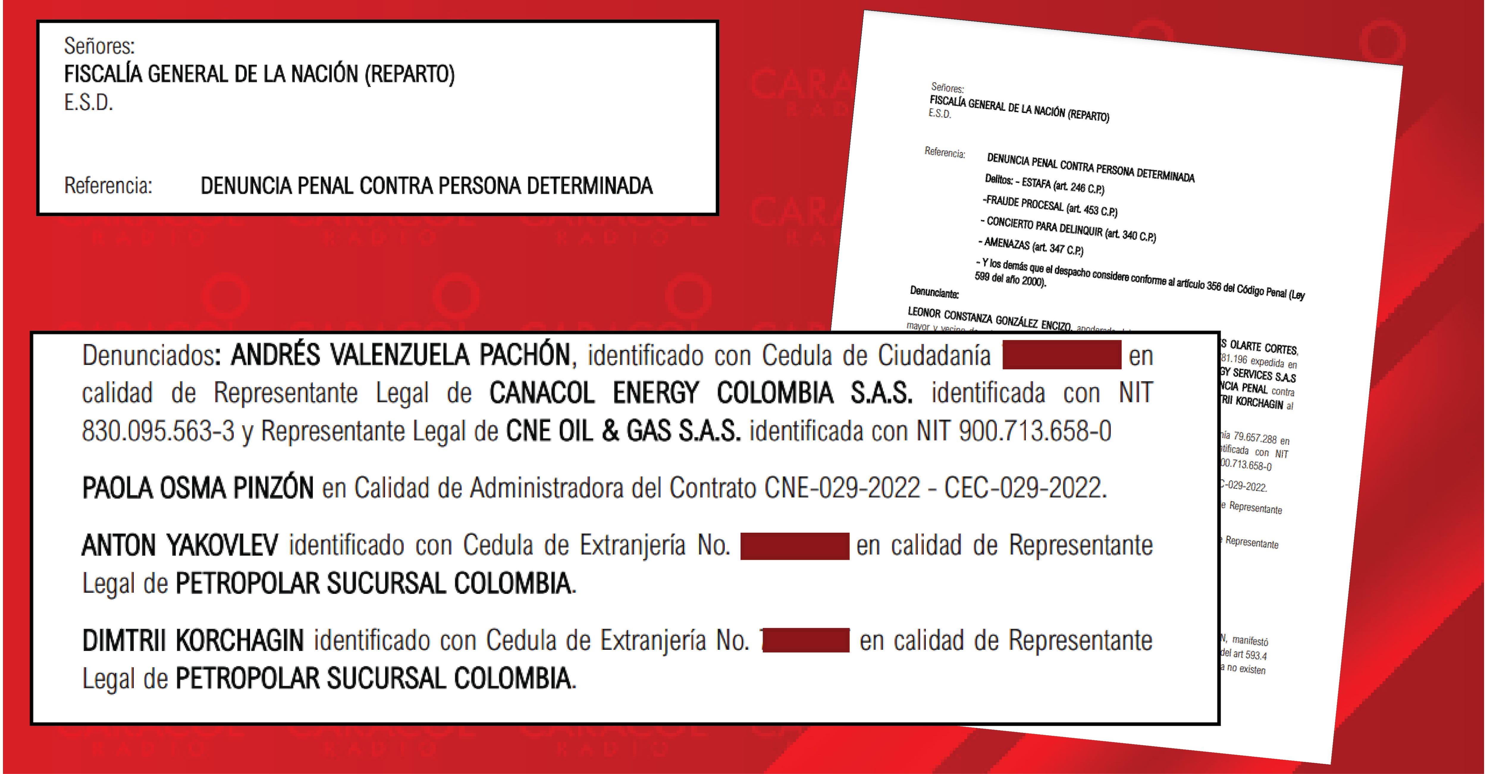De manera inicial, un fiscal de la Unidad de fe Pública y Orden Económico indaga por las actuaciones sospechosas de Andrés Valenzuela Pachón, representante legal de CANACOL Energy; Paola Osma Pinzón en calidad de administradora del contrato; y los representantes legales de PETROPOLAR Sucursal Colombia; Dimtrii Korchagin y Anton Yakovlev. ((VER DENUNCIA))