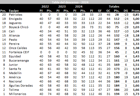 Entretanto, Envigado cayó 2-1 en su visita a Atlético Nacional, en un juego donde los Naranjas protestaron contra el arbitraje al final del partido. El promedio del equipo se mantiene en 1.00, pero cada vez más cerca de Jaguares, con 0.98