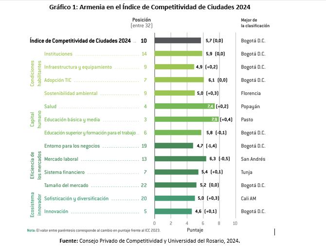 El Consejo Privado de Competitividad (CPC) y la Universidad del Rosario presentan su Índice de Competitividad de Ciudades (ICC) 2024. En esta oportunidad, la ciudad de Armenia ocupa el puesto 10 en la medición, registrando un puntaje de 5,7 sobre 10, y se ubica por delante de Cartagena, Neiva e Ibagué.