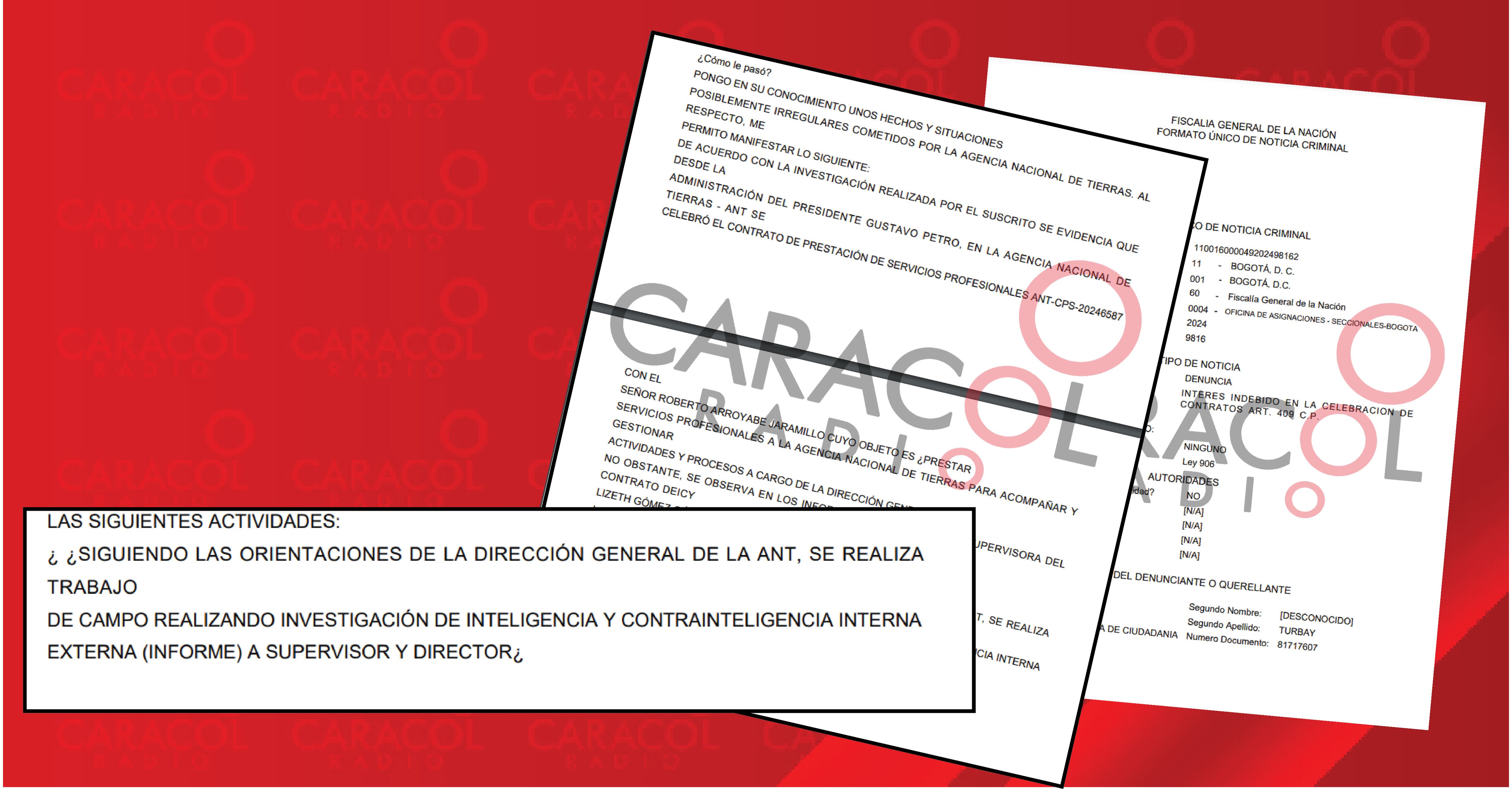 La Fiscalía abrió indagación por los informes de “perfilamientos” e “inteligencia” que se habrían hecho desde la Agencia Nacional de Tierras, denuncia que hizo el senador Miguel Uribe en el programa Hora 20 y el noticiero de medio día de Caracol Radio.