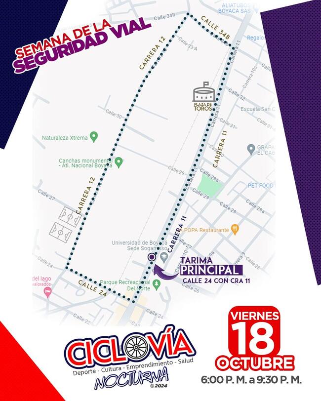 La ciclovía nocturna, que originalmente estaba programada para el domingo 20, se adelantará al viernes 18 de octubre y se llevará a cabo desde las 6 a 9:30 p.m. El recorrido, de 2.860 metros, iniciará en la carrera 11 con calle 26, seguirá hacia la calle 24, luego a la carrera 12, hasta la calle 34, y retornará al punto de partida. Este circuito permitirá a los participantes disfrutar de una noche activa y segura en compañía de familiares, amigos y mascotas.