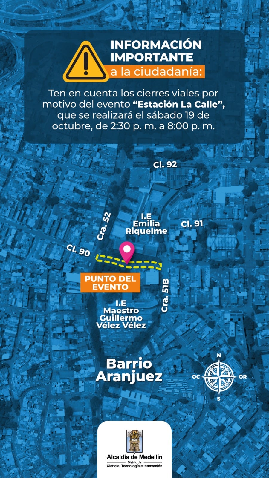 Este sábado, en marco de la Feria de la Antioqueñidad, habrá cierres viales en la carrera 28B entre calles 38F y 40A del barrio Loreto. Adicionalmente, será necesario el cierre total de la carrera 29A entre las carreras 28B y 30, y la carrera 29 entre la carrera 28B y la calle 40A. El propósito es garantizar las condiciones de seguridad vial de asistentes, residentes y transeúntes de la zona. Estas medidas se ejecutarán entre las 8:00 a. m. del sábado y la 1:00 a. m. del domingo.