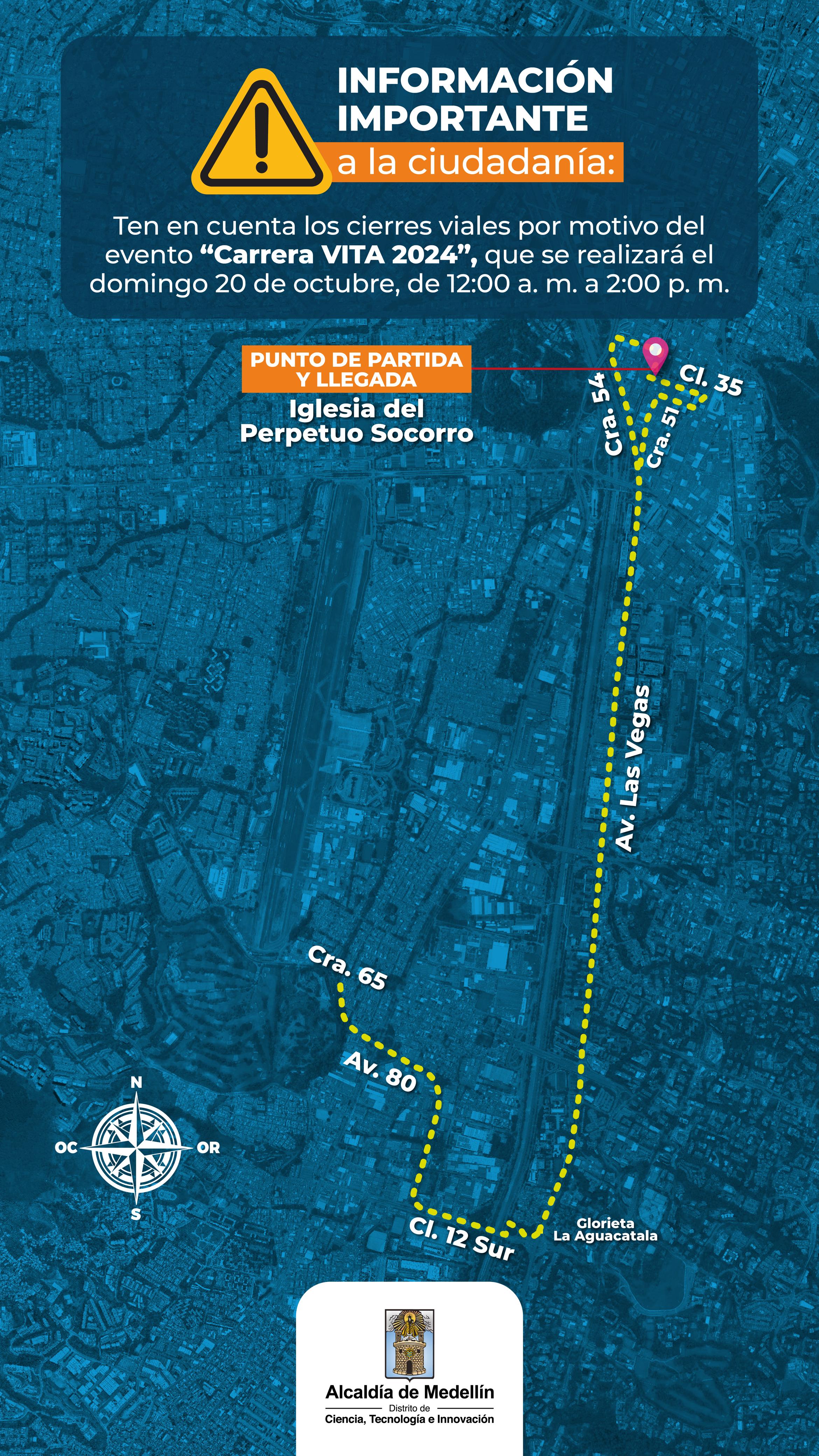 El domingo, 20 de octubre, se hará la Carrera Vita, una competencia atlética tipo maratón en la que se esperan más de 1.800 atletas de running en categorías 15K, 10K y 5K. El evento será desde las 6:30 a. m. y las 9:30 a. m. y se programó con cierres viales de la calle 36, carrera 45A, calle 34, carrera 50 (Palacé), calle 36, carrera 54, carrera 48 (avenida Las Vegas), calle 12 sur, carrera 50FF (avenida 80), calle 6 sur, carrera 65 y calle 2 sur. Además, habrá cierre sobre las vías adyacentes al punto de llegada y salida, es decir, calle 35 entre carreras 46 y 51 (Bolívar) y sobre la carrera 51 (Bolívar) entre calles 32 y 37. Debido a la logística y para efectos de montaje, los cierres se darán desde las 00:00 horas del domingo y hasta las 2:00 p. m. del mismo día.