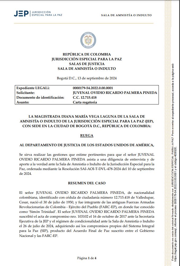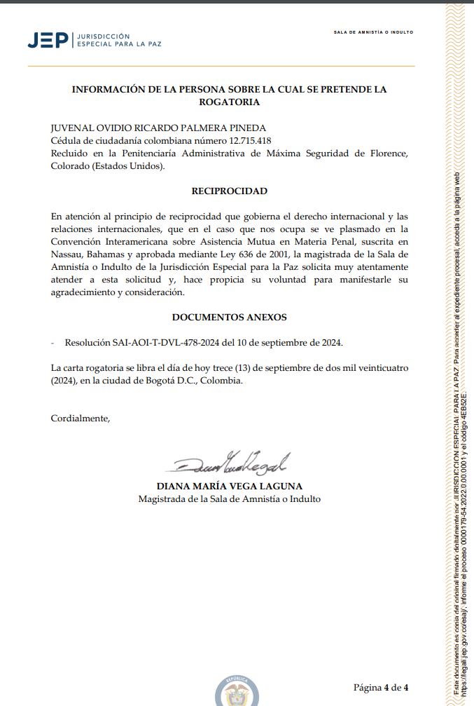 “Acudiendo al principio de cooperación internacional, según lo dispuesto en la Convención Interamericana sobre Asistencia Mutua en Materia Penal, suscrita en Nassau, Bahamas y aprobada mediante Ley 636 de 2001, requiere su asistencia judicial a efectos de que se permita que el señor Juvenal Ovidio Ricardo Palmera Pineda asista a una diligencia de entrevista y de aporte a la verdad ante la Jurisdicción Especial para la Paz, presencialmente, en la Penitenciaría Administrativa de Máxima Seguridad de Florence, Colorado (Estados Unidos) y a todas aquellas diligencias judiciales y entrevistas que esta magistratura disponga”, se lee en el documento.