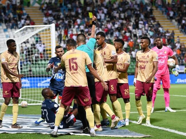Álex Castro (Deportes Tolima) ha visto tarjeta amarilla por juego peligroso.