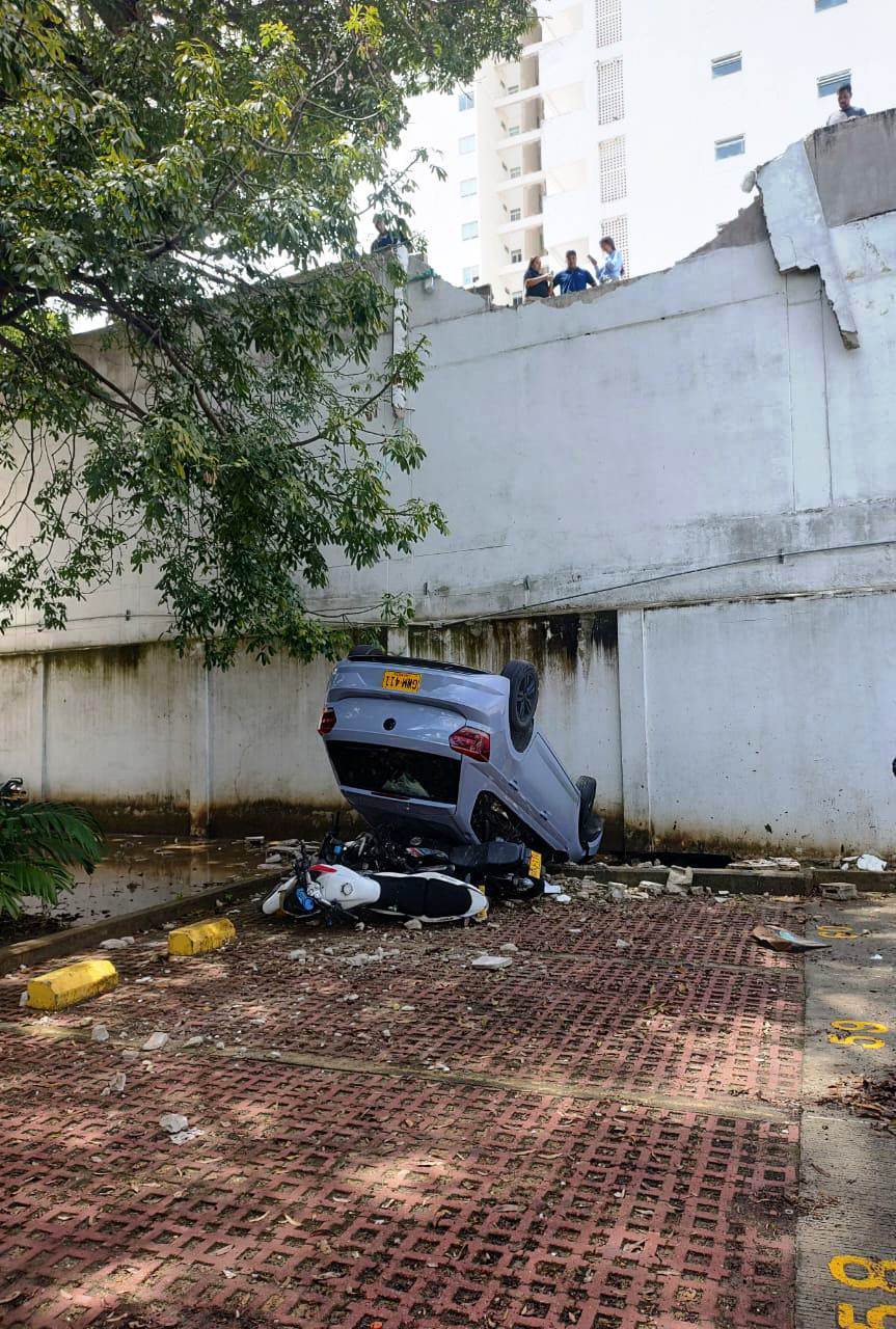 Un vehículo cayó desde el tercer piso del edificio Vista Bahía, al parqueadero de la nueva sede del Comando de Policía en el barrio Manga; el hecho por fortuna no dejó fallecidos, pero sí una mujer herida.