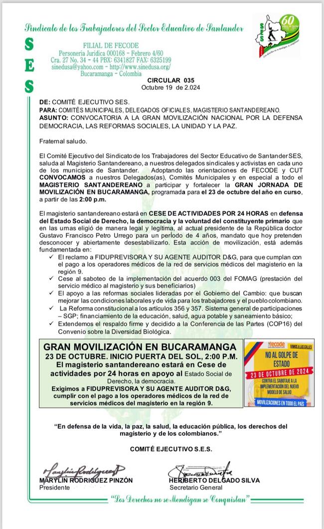Además, el magisterio se une a esta movilización, tendrá cese de actividades durante 24 horas, solicitando a la Fiduprevisora cumplir con el pago a los operadores de la red de servicios médicos de los docentes.