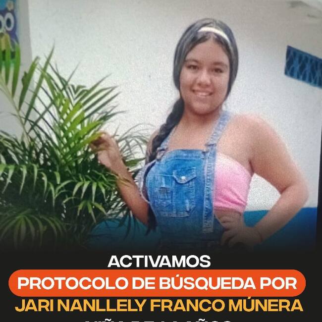 “Con gran preocupación activamos protocolo de búsqueda por Jari Nanllely Franco Múnera. Necesitamos todas las solidaridad del pueblo de Barboseño y todos los habitantes metropolitanos para que activemos la búsqueda de esta niña. No se puede perder ningún niño en ninguna parte, ninguna persona. La esperamos salva en su casa”, dijo el mandatario.