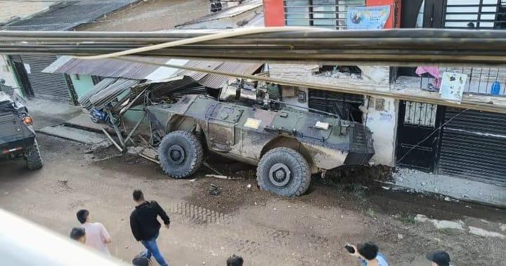 En mi propia casa donde estoy viviendo cayó uno de los explosivos y pues nos tocó salir ahí mismo, sin nada en la mano, salir con lo que tengamos y buscar otro lugar seguro. Pero cuando ya se posicionaron aquí las tanquetas pues la verdad fue muy tétrica porque así colapso el puesto de salud, las calles no podían hacer uno ningún movimiento en falso porque había tiroteos”.