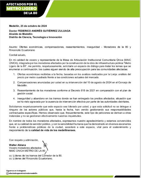 A través de una carta, integrantes de la Mesa de Articulación Institucional Comunitaria Única compuesta por los Moradores Afectados por la construcción del Metro de la 80 solicitó un espacio formal de diálogo con el alcalde de Medellín, Federico Gutiérrez, con el objetivo de abordar temas como las ofertas económicas por las viviendas, la reubicación de moradores, la seguridad de predios ya entregados, entre otros, los cuales, estarían generando preocupación en las personas que componen dicho grupo.