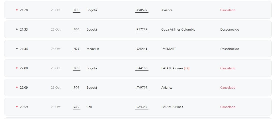 Según el aeropuerto, durante la noche del 25 de octubre cinco vuelos fueron cancelados. Por su parte, los vuelos programados para el 26 de octubre continúan sin novedad. Sin embargo, la autoridad aérea recomienda a los usuarios con viajes desde o hacia Santa Marta contactar a su aerolínea para más detalles y actualizaciones sobre los vuelos.