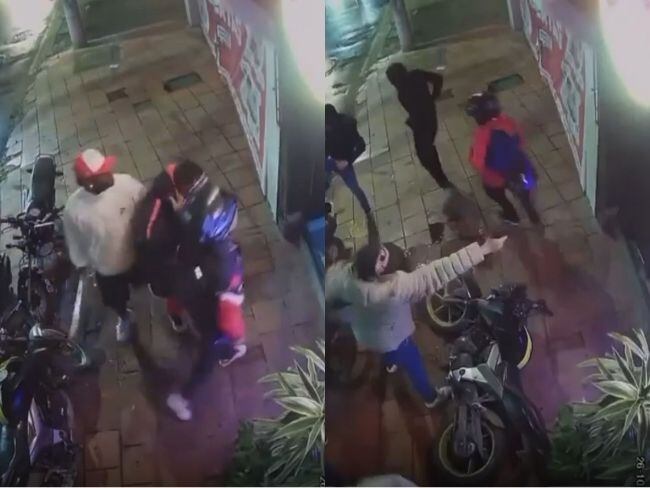 En el video de una cámara de seguridad, se ve cómo al menos 10 integrantes de la hinchada de Santa Fe van llegando y agreden a otras cuatro personas de Millonarios e intentan dañar sus motocicletas.