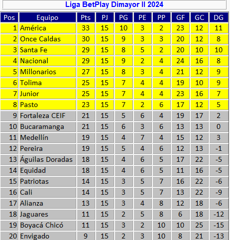 Este lunes, por su parte, Medellín goleó 4-1 a Jaguares en el estadio Atanasio Girardot, resultado que lo dejó con 19 puntos aún con chances de clasificar. Los goles fueron obra de Leyser Chaverra, Francisco Chaverra, Mender García y Juan David Arizala, para el local, y de Jáder Maza, para la visita.