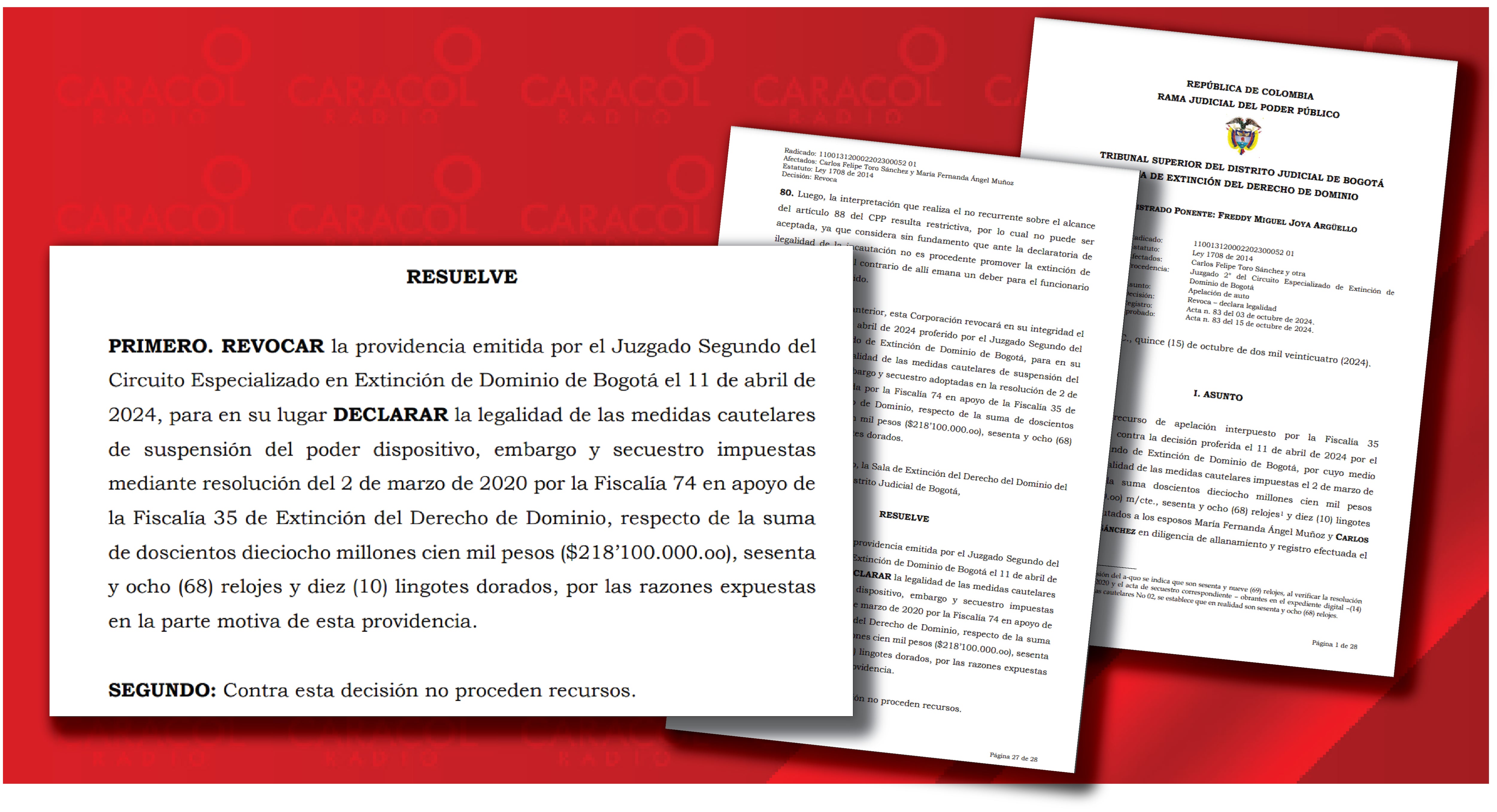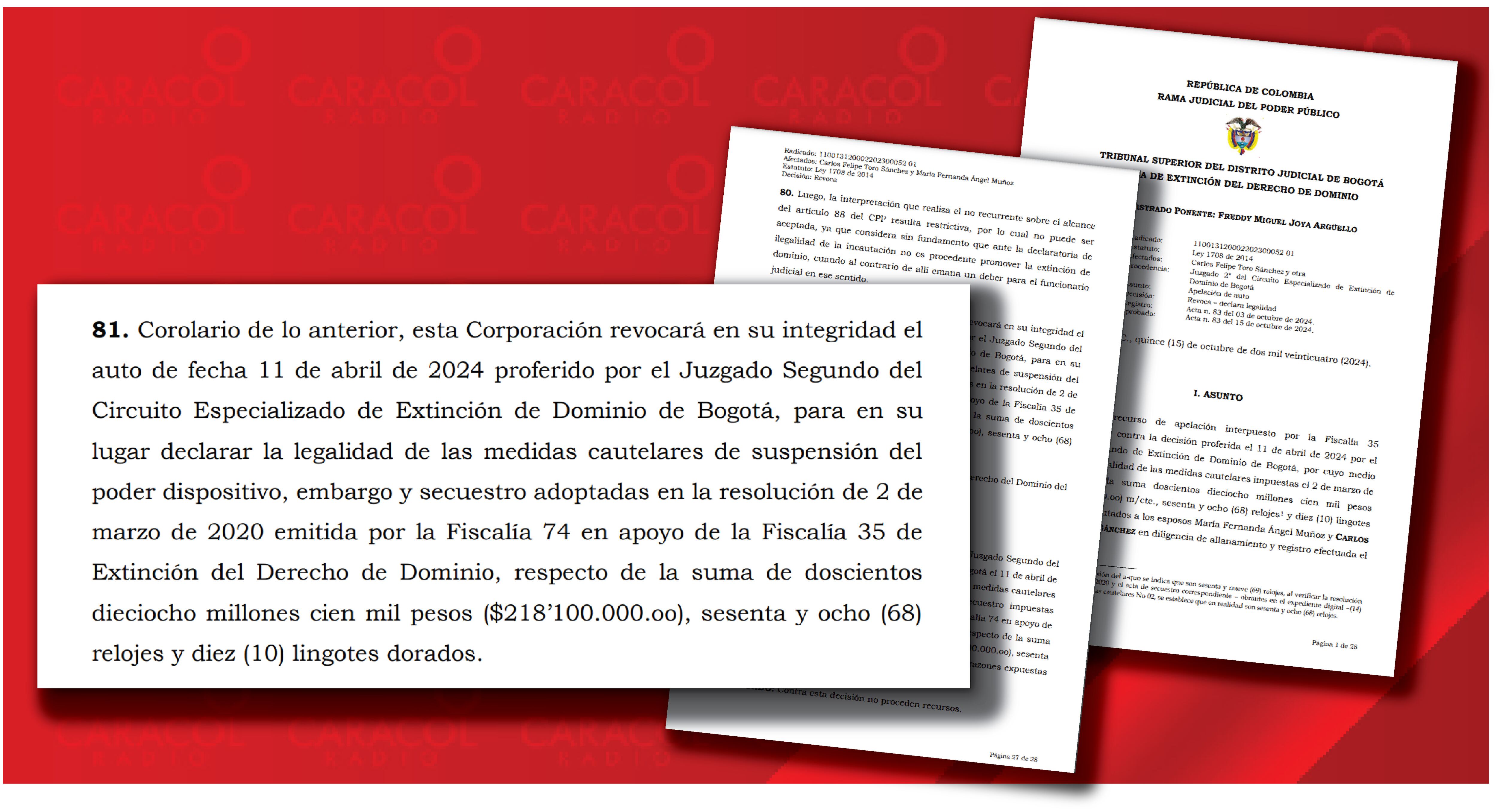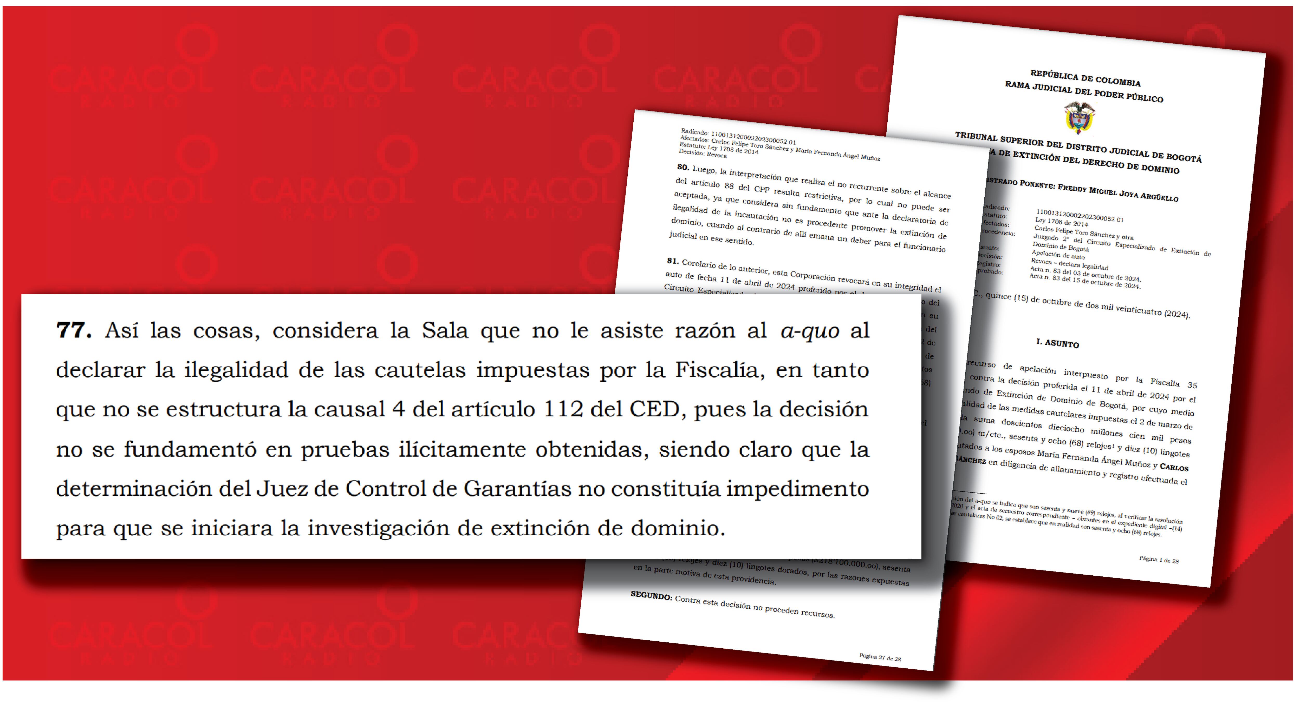 “Así las cosas, considera la Sala que no le asiste razón al a-quo al declarar la ilegalidad de las cautelas impuestas por la Fiscalía, en tanto que no se estructura la causal 4 del artículo 112 del CED, pues la decisión no se fundamentó en pruebas ilícitamente obtenidas, siendo claro que la determinación del Juez de Control de Garantías no constituía impedimento para que se iniciara la investigación de extinción de dominio”, dice la decisión del Tribunal.