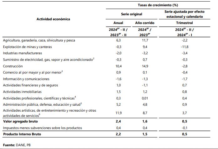 El último informe del DANE, sobre el Producto Interno Bruto (PIB) de Bogotá, tiene como finalidad presentar la dimensión y la dinámica del crecimiento macroeconómico de la ciudad. En este informe se registró, que este indicador, en el segundo trimestre del 2024 tuvo un crecimiento del 2,2% con respecto al mismo periodo del año anterior.