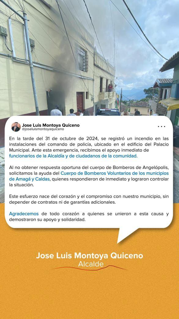 En la tarde de este jueves se reportó una emergencia en la alcaldía del municipio de Angelópolis por un incendio en sus instalaciones que generó una alerta. La comunidad rápidamente se activó y ayudó a controlar la conflagración; luego, bomberos de las vecinas poblaciones de Caldas y Amagá apoyaron la situación y terminaron con la extinción de las llamas.