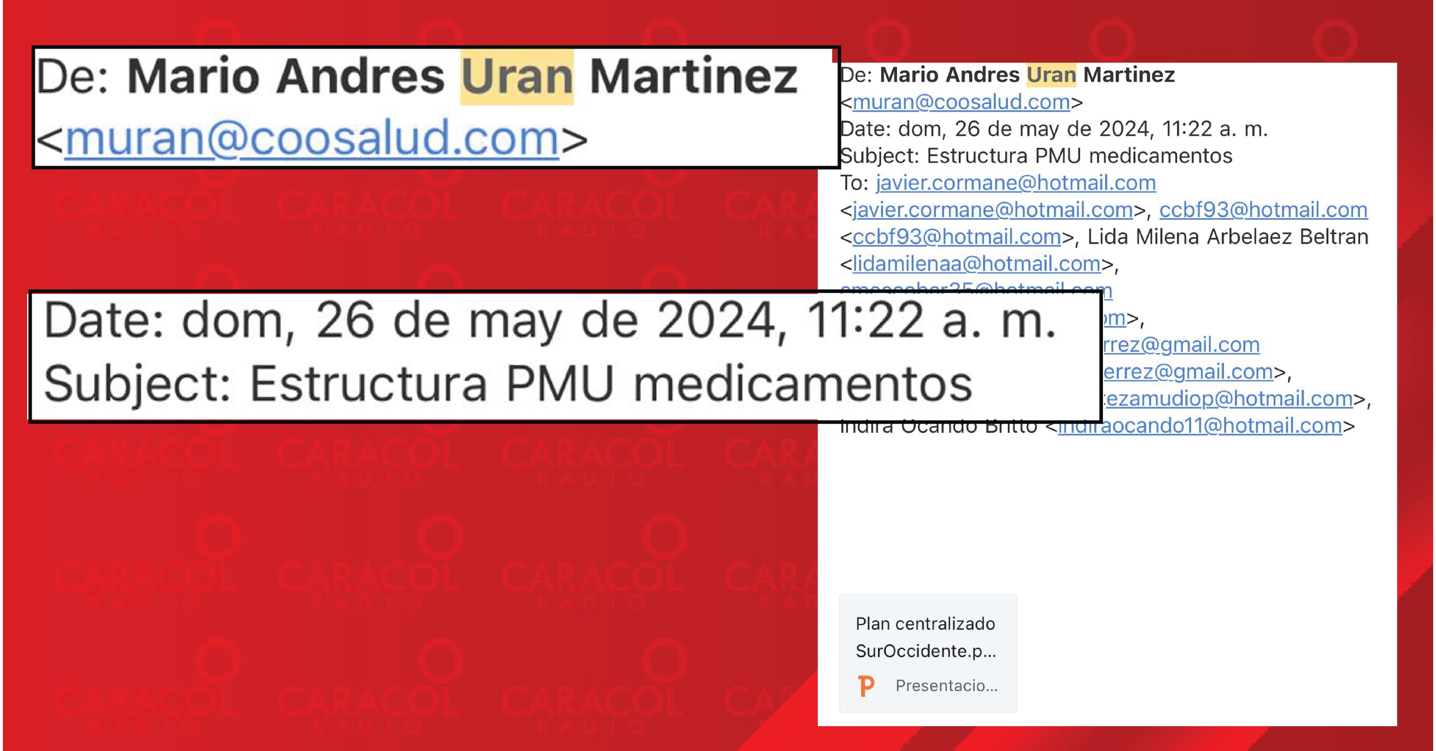 Es decir, los interventores que nombró el gobierno enviaban información confidencial a Urán antes de que lo conociera la Supersalud tal y como lo informó la Unidad Investigativa de Caracol Radio en septiembre pasado. ((VER CORREOS))