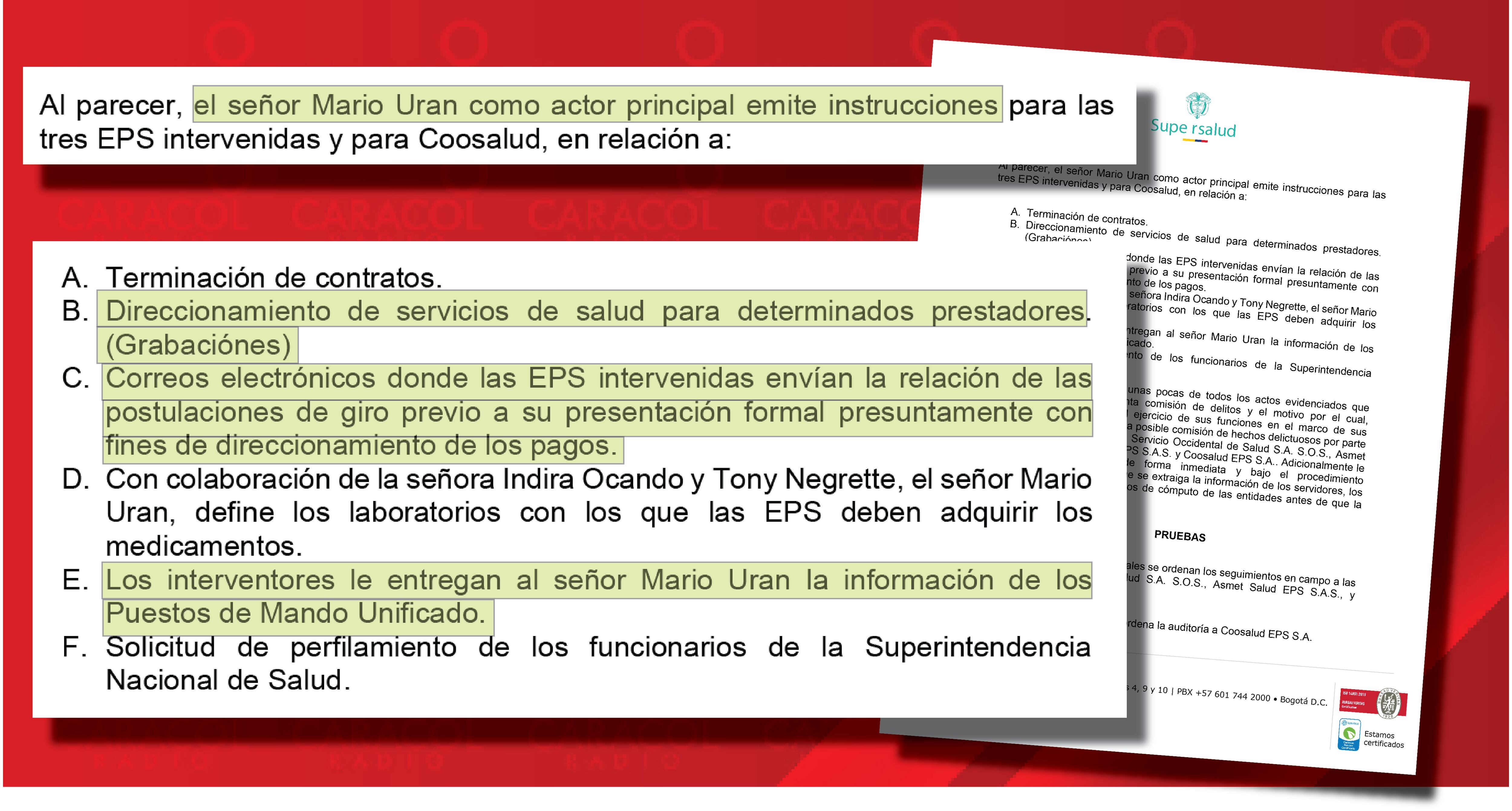 También señala a Mario Urán como el actor principal que “emite instrucciones para las tres EPS intervenidas y para Coosalud” direccionando servicios de salud para determinados prestadores; los interventores le entregan al señor Mario Uran la información de los Puestos de Mando Unificado. (por eso estaba bien informado) ((VER DOCUMENTO DENUNCIA))