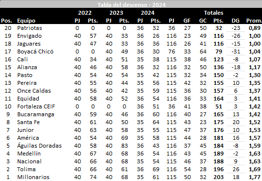Tabla del descenso en 2024