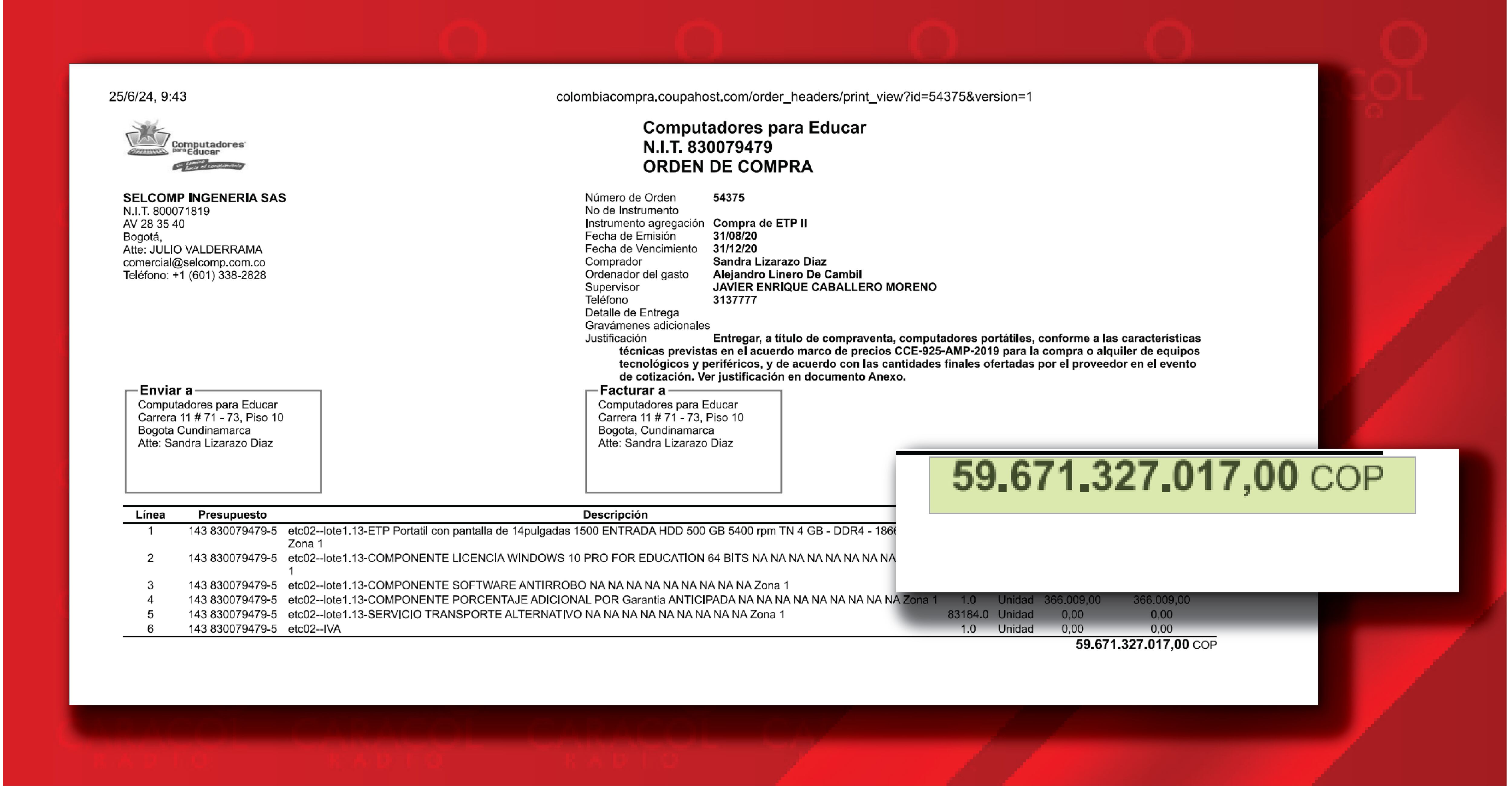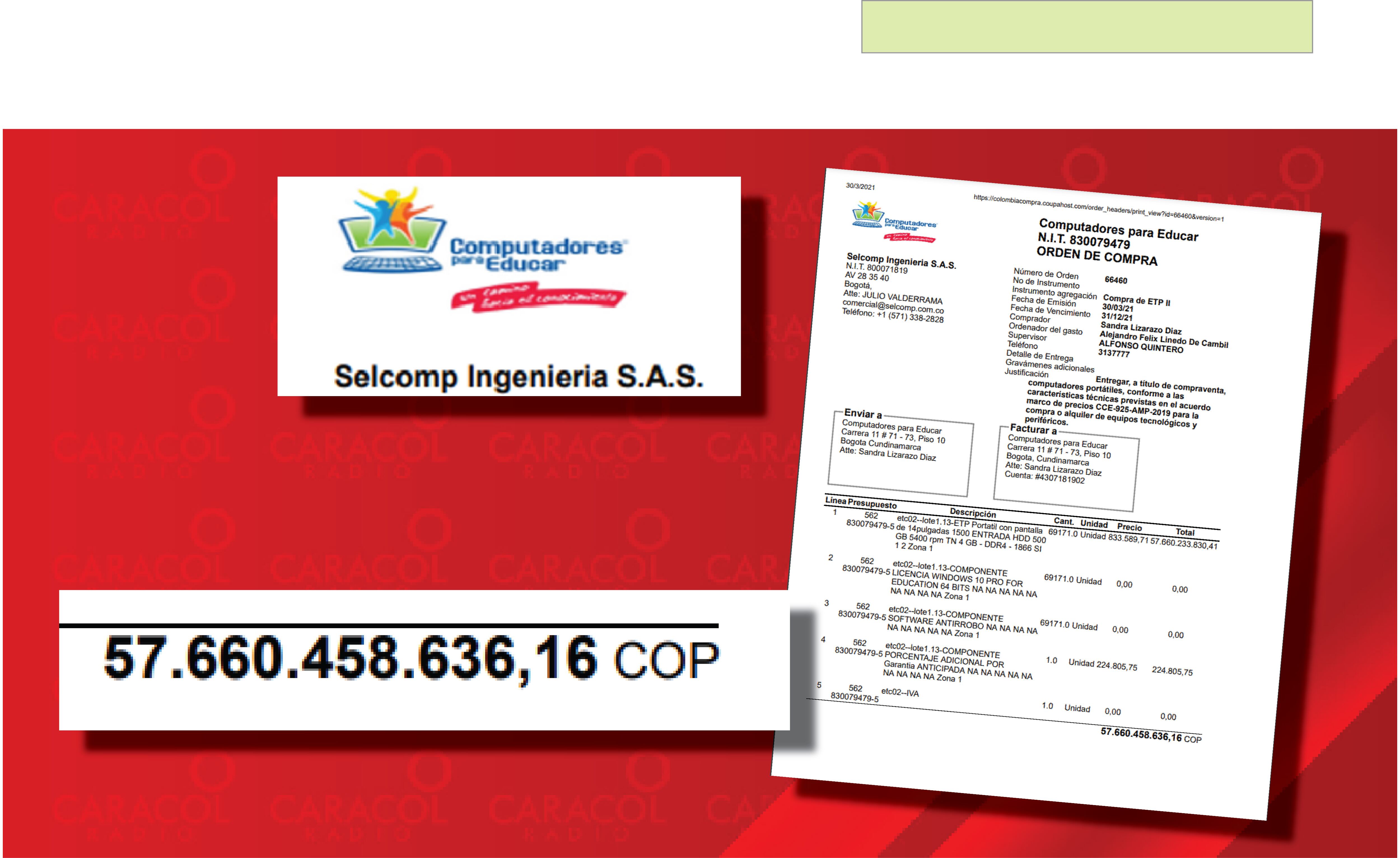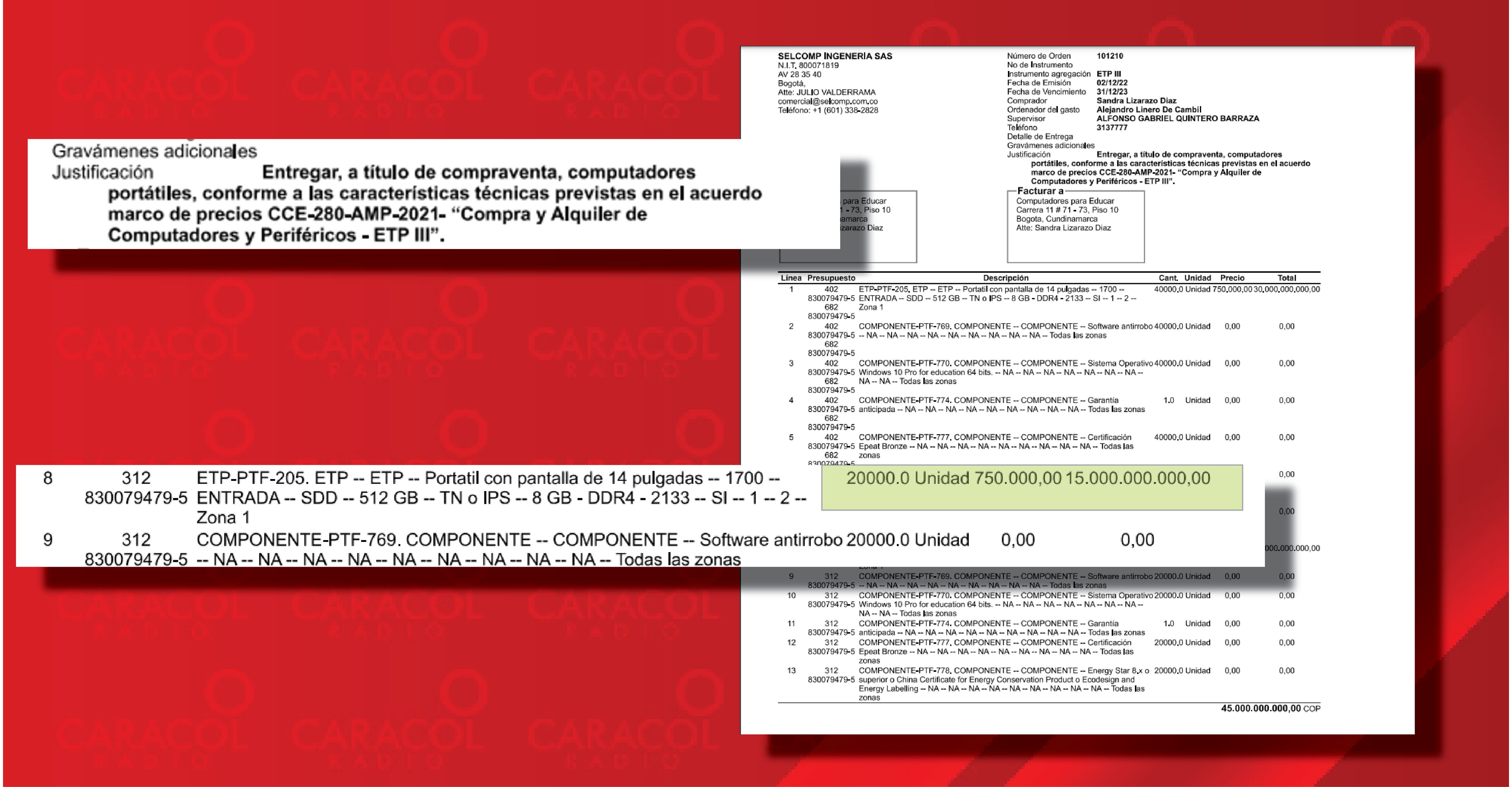 De todas las órdenes de compra a Selcomp Ingeniería y el fabricante Compumax, la más cuestionable para las autoridades es la 101210 de 2022. De los 60 mil portátiles comprados la mitad no sirvió.