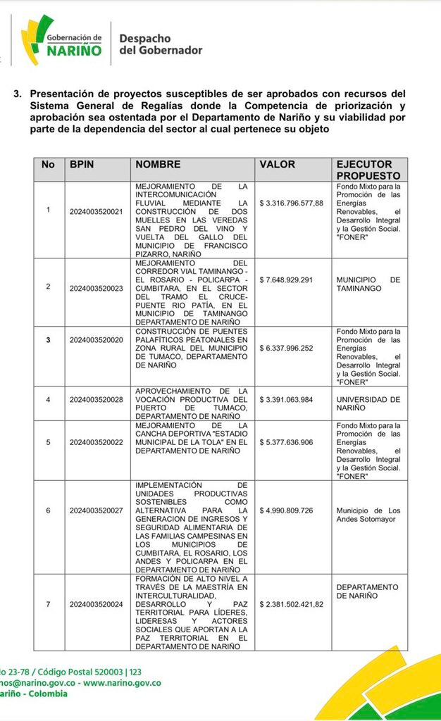 “De acuerdo con el Acta de Comité de priorización de estos proyectos se evidencia que se eligieron 7, de los cuales, 4 serán ejecutados por: la Universidad de Nariño, el Municipio de Taminango, el Municipio de Los Andes - Sotomayor y el Departamento de Nariño”