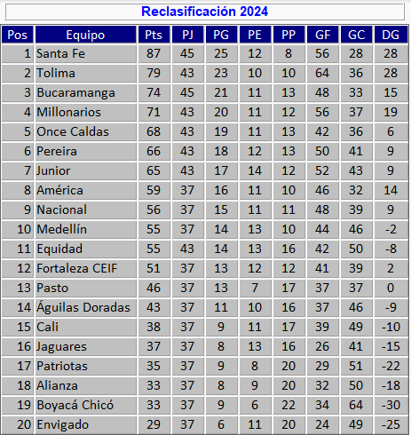 Independiente Santa Fe lidera la tabla con 87 puntos y su participación en la Copa Libertadores está muy cerca de ser segura. El conjunto Cardenal cuenta con una diferencia de 8 unidades respecto al segundo, que es Deportes Tolima con 79 y, de momento, es el otro club que iría al máximo torneo de Sudamérica.
