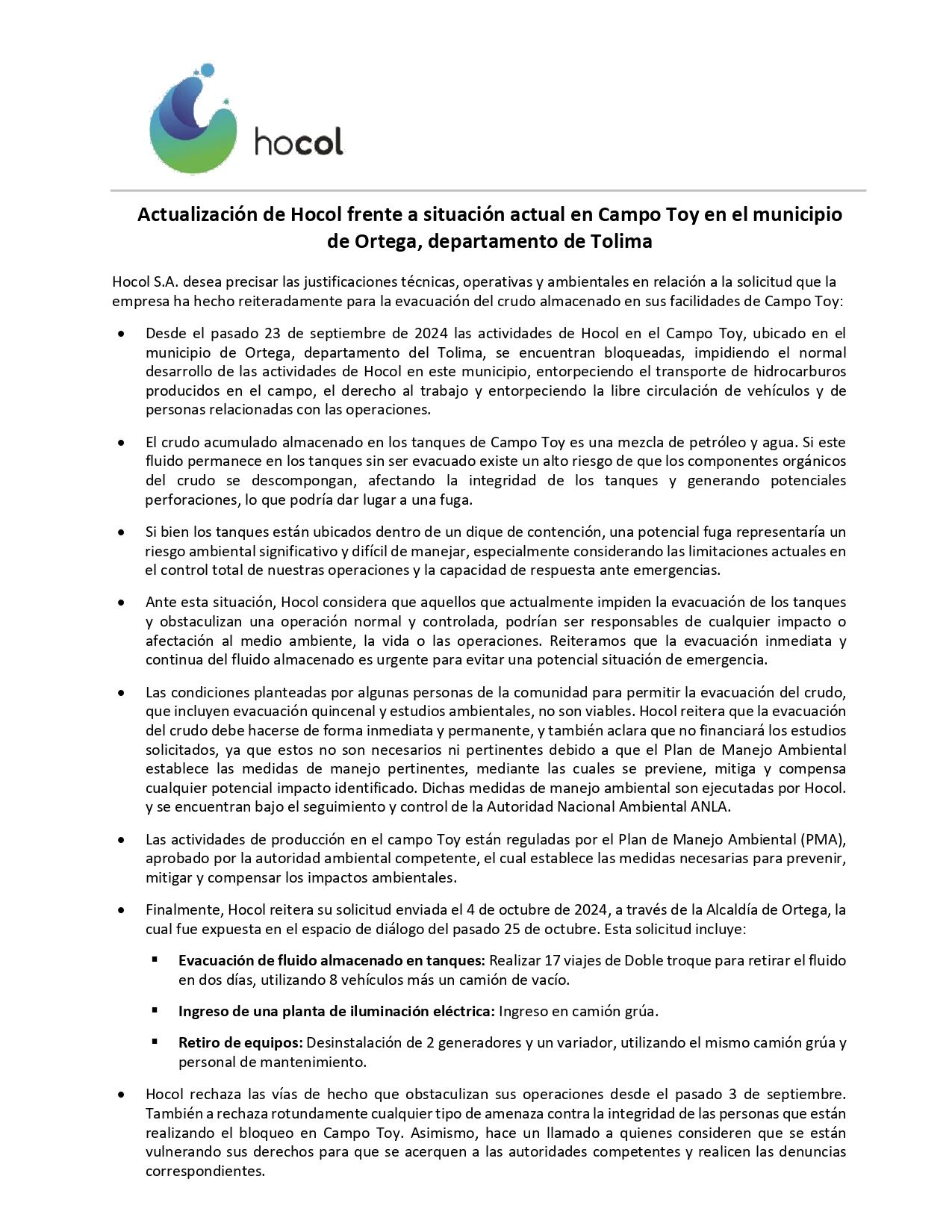 Comunicado Hocol frente al bloqueo del campo Toy en Ortega, Tolima