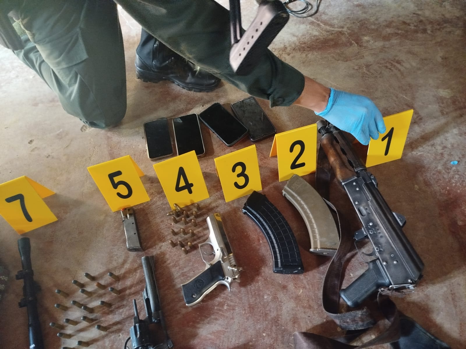 En el procedimiento fueron incautados 75 cartuchos 7.62, 18 cartuchos 38 milímetro, 40 cartuchos 9 milímetros, 01 Subfusil MDL PAP M92PV calibre 7.62 x 39MM Zastava Serbia, una pistola, un revólver, tres proveedores, un chaleco multipropósito pixelado, una escopeta y cuatro teléfonos celulares. Elementos que se encontraban en la modalidad de caleta en el techo de la vivienda y dentro de colchones para no ser hallados por la Policía.