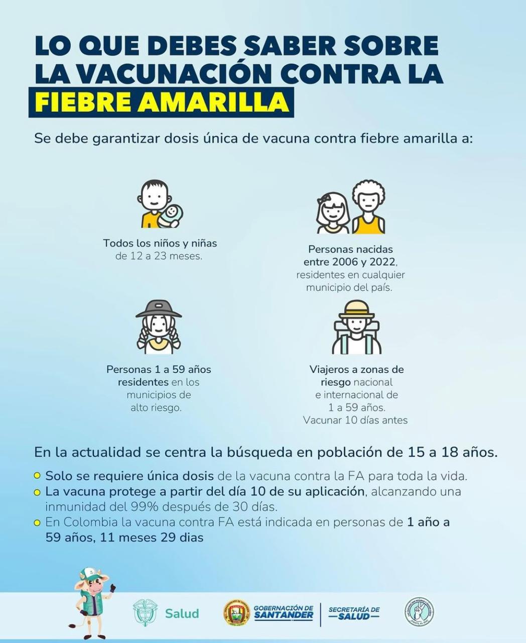 “En Santander algunos territorios están en riesgo, incluido Barrancabermeja, por esto es importante mencionar que estuvimos adheridos a la Jornada Nacional de Vacunación que se realizó recientemente, pero asimismo vendrá una nueva jornada de vacunación para el mes de noviembre. Igual, todos los usuarios pueden acudir a su EPS y solicitar su vacuna de fiebre amarilla”, indicó el secretario Distrital de Salud, Andrés Manosalva Camargo