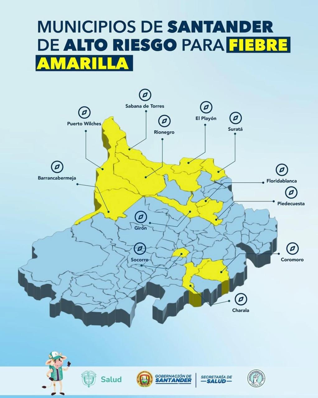 Según el reporte nacional dado al Ministerio de Salud, los municipios más afectados por el brote de fiebre amarilla en Santander son: Puerto Wilches, Bucaramanga, Barrancabermeja, Charalá, Coromoro, El Playón, Suratá, Floridablanca, Girón, Piedecuesta, Rionegro y Sabana de Torres