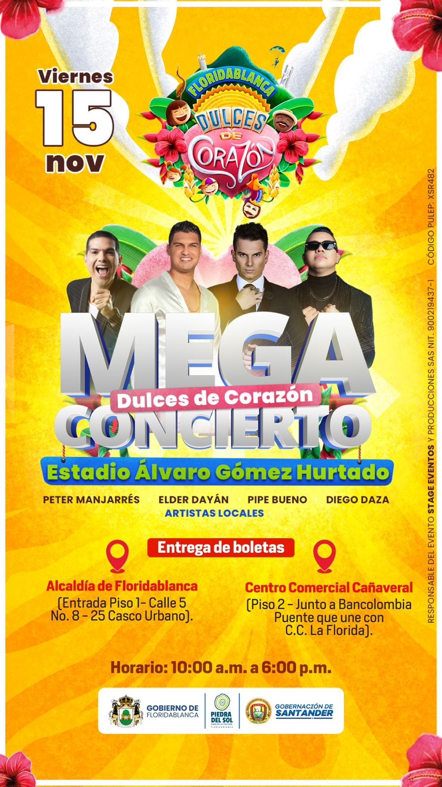 El ‘Mega Concierto Dulces de Corazón’ del que participarán artistas como Peter Manjarrés, Elder Dayán Díaz, Pipe Bueno y Diego Daza tendrá entrada gratuita. Sin embargo, hay que reclamar las boletas en dos puntos de Floridablanca.