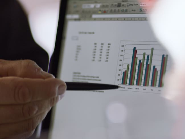 Asesor financiero muestra resultados de gráfico de barras en computadora portátil (Getty Images)
