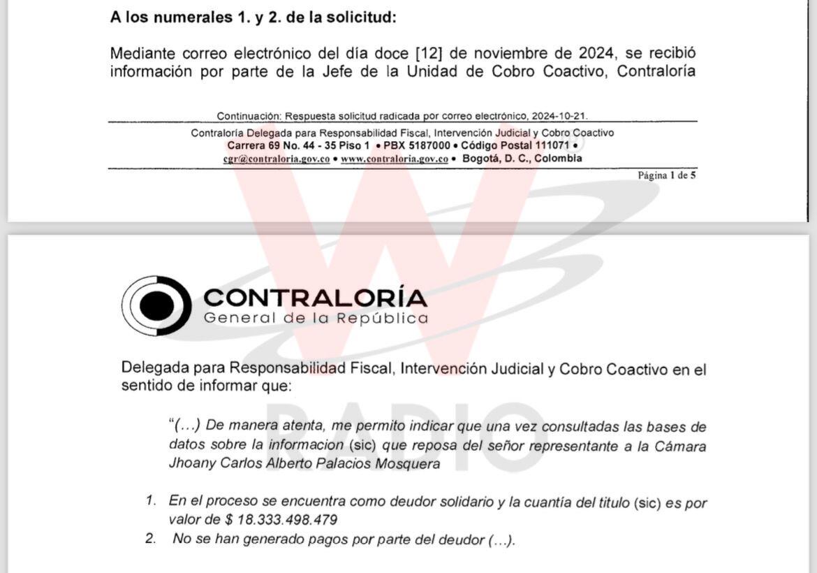 La W conoció que el representante liberal a la Cámara, Jhoany Carlos Alberto Palacios, no ha respondido por una sanción fiscal de la Contraloría.