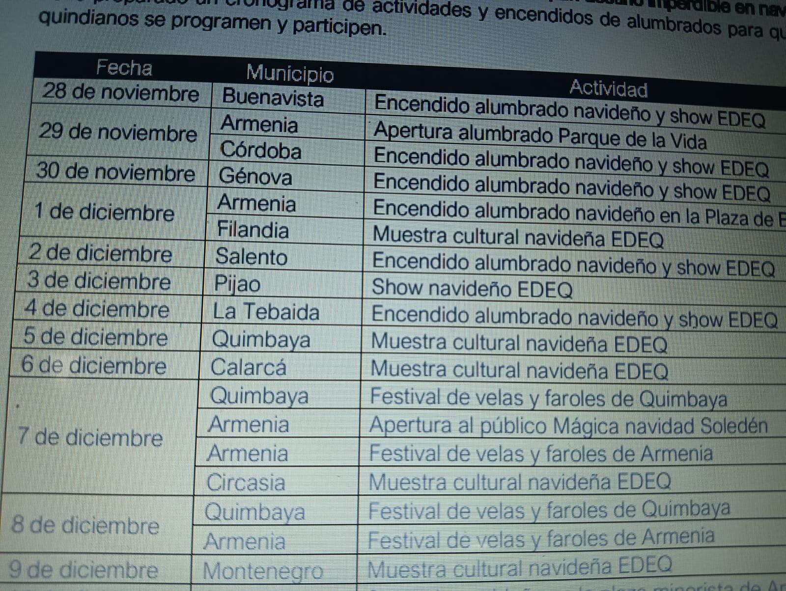 Por su parte EDEQ, junto con las administraciones municipales de Génova, La Tebaida, Buenavista, Córdoba y Salento, ofrecerán alumbrados navideños en las plazas principales de cada municipio con temáticas centradas en la navidad tradicional. Las alcaldías de Calarcá, Circasia, Montenegro y Filandia tendrán decoradas sus calles y puntos más importantes, de igual forma lo hará la administración Quimbaya que además presentará su icónico festival de velas y faroles los días 7 y 8 de diciembre.