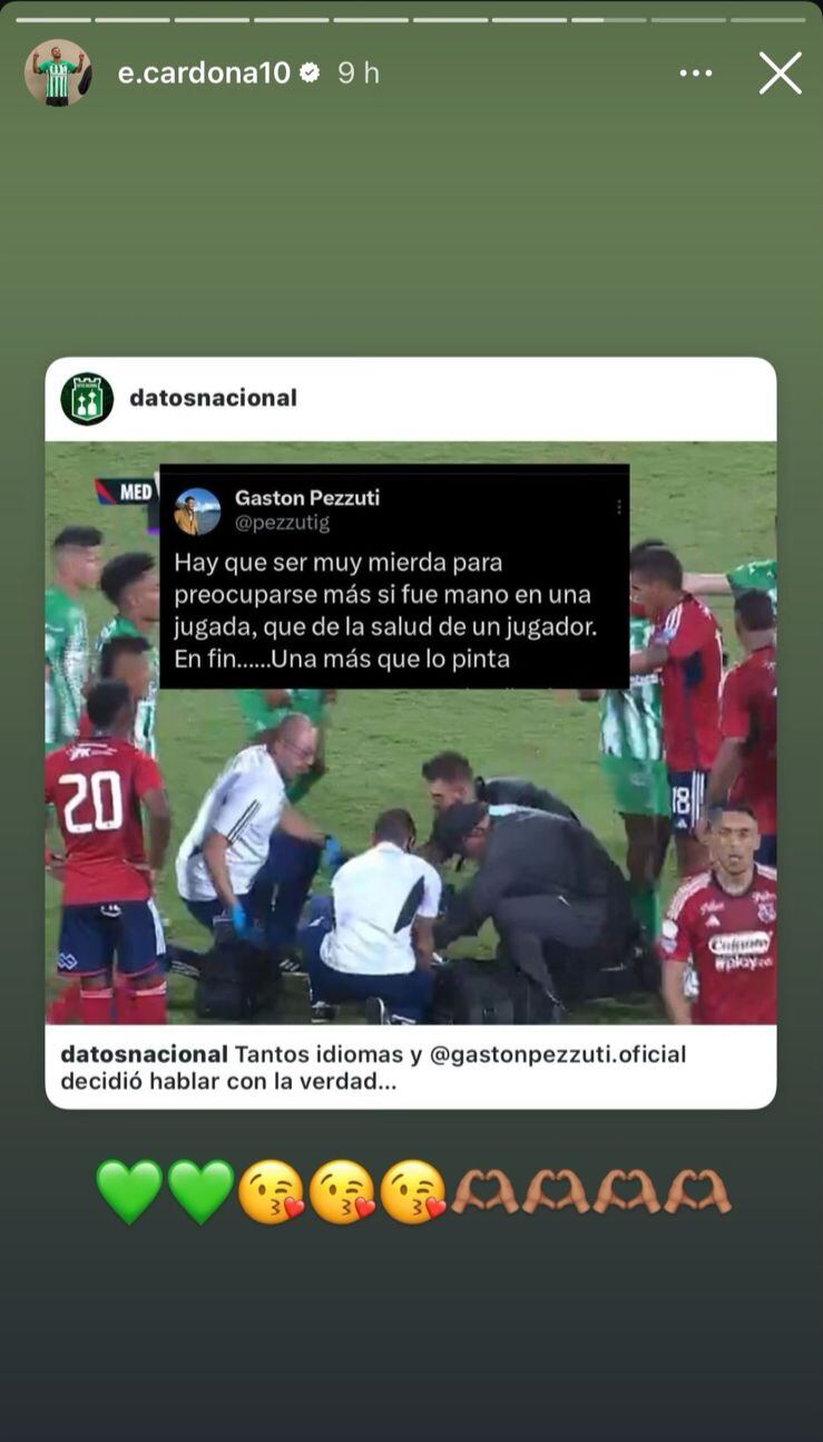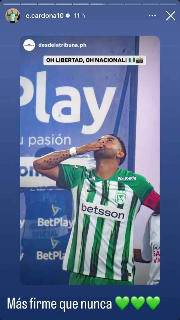 Luego de darse a conocer la sanción impuesta por el Comité Disciplinario de la Dimayor, Edwin Cardona reposteó varias historias en su cuenta de Instagram, todas ellas relacionadas al clásico frente al Independiente Medellín. En una se lo ve en los actos protocolarios a blanco y negro; en otra escribió: “Más firme que nunca”, mientras se ve en video cantando el himno de Antioquia; en otra se une a la severa crítica de Gastón Pezzuti, tras el golpe y la consecuente expulsión que sufrió Luis Marquines en el último clásico.