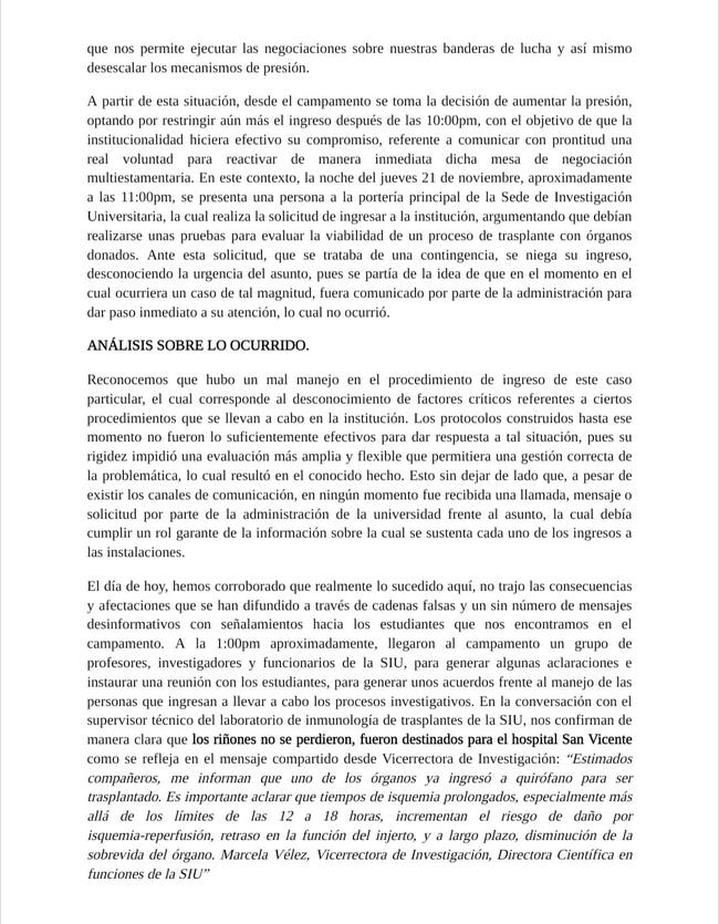 Sobre el episodio con el ingreso de los órganos, le explicaron a Caracol Radio que la noche del jueves 21 se presentó una persona a la portería principal de la Sede de Investigación Universitaria, para realizar unas pruebas para evaluar la viabilidad de un proceso de trasplante con órganos donados. La persona no estaba en la lista mencionada y no se les informó de la prioridad de su investigación, por lo cual su ingreso fue negado.