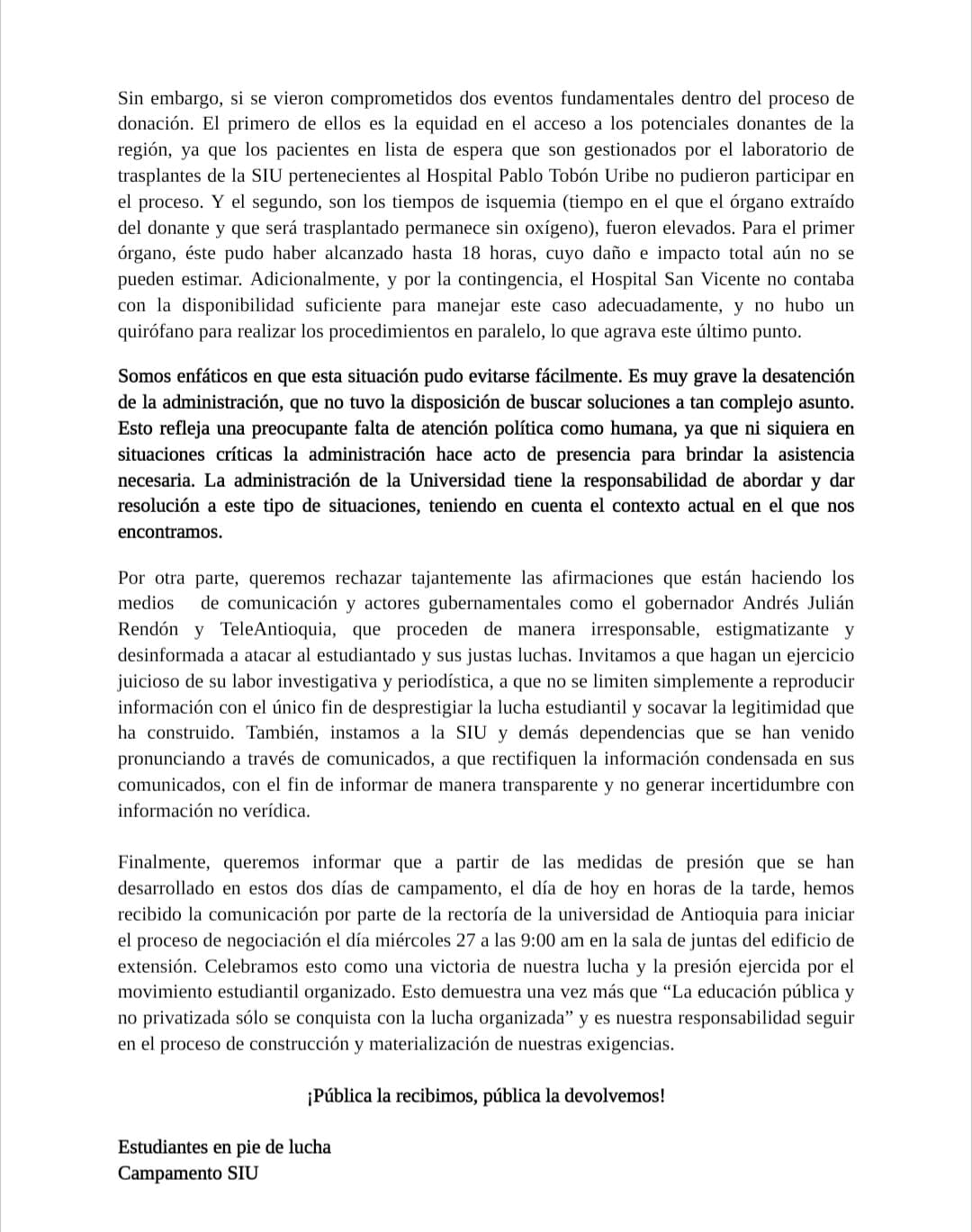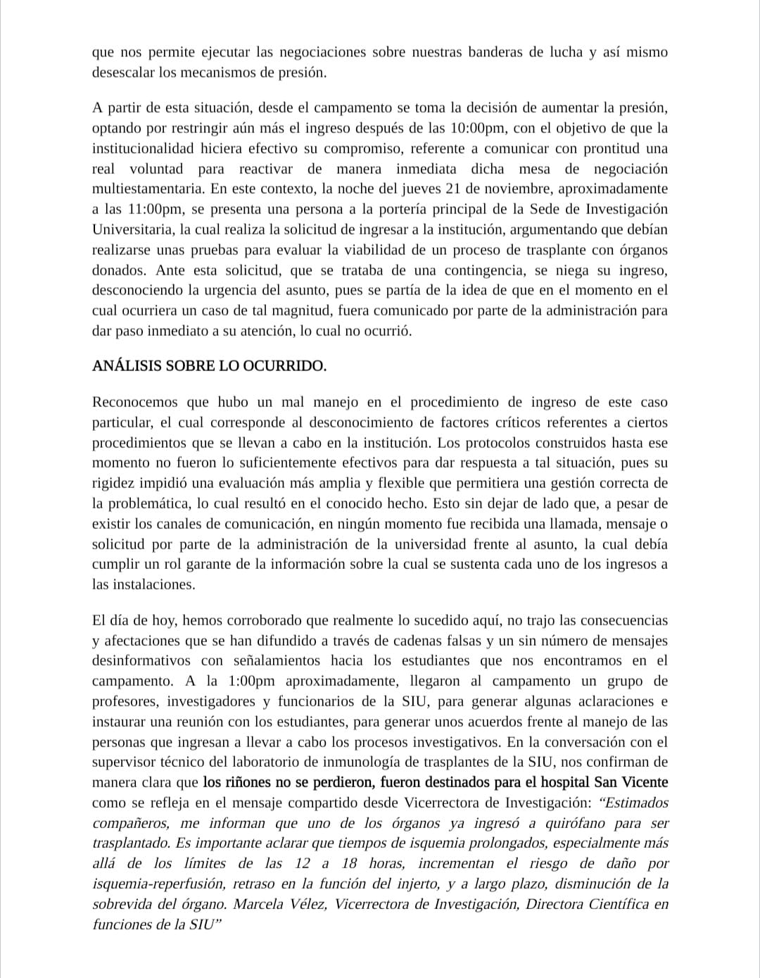 Sobre el episodio con el ingreso de los órganos, le explicaron a Caracol Radio que la noche del jueves 21 se presentó una persona a la portería principal de la Sede de Investigación Universitaria, para realizar unas pruebas para evaluar la viabilidad de un proceso de trasplante con órganos donados. La persona no estaba en la lista mencionada y no se les informó de la prioridad de su investigación, por lo cual su ingreso fue negado.