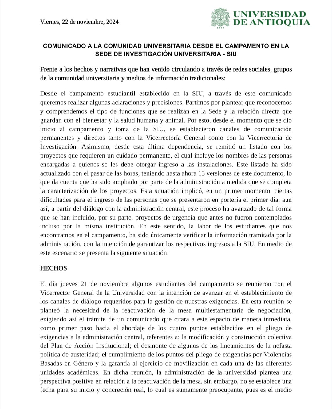 “La interrupción del ingreso a la SIU tiene paralizadas por completo las labores de este importante centro de investigación del país, lo que genera serias afectaciones al soporte científico y asistencial que la Universidad presta a diferentes hospitales y centros de salud para la realización de pruebas de laboratorio y procedimientos de alta complejidad.” Menciona el comunicado donde las directivas de la UdeA rechazaron los hechos.