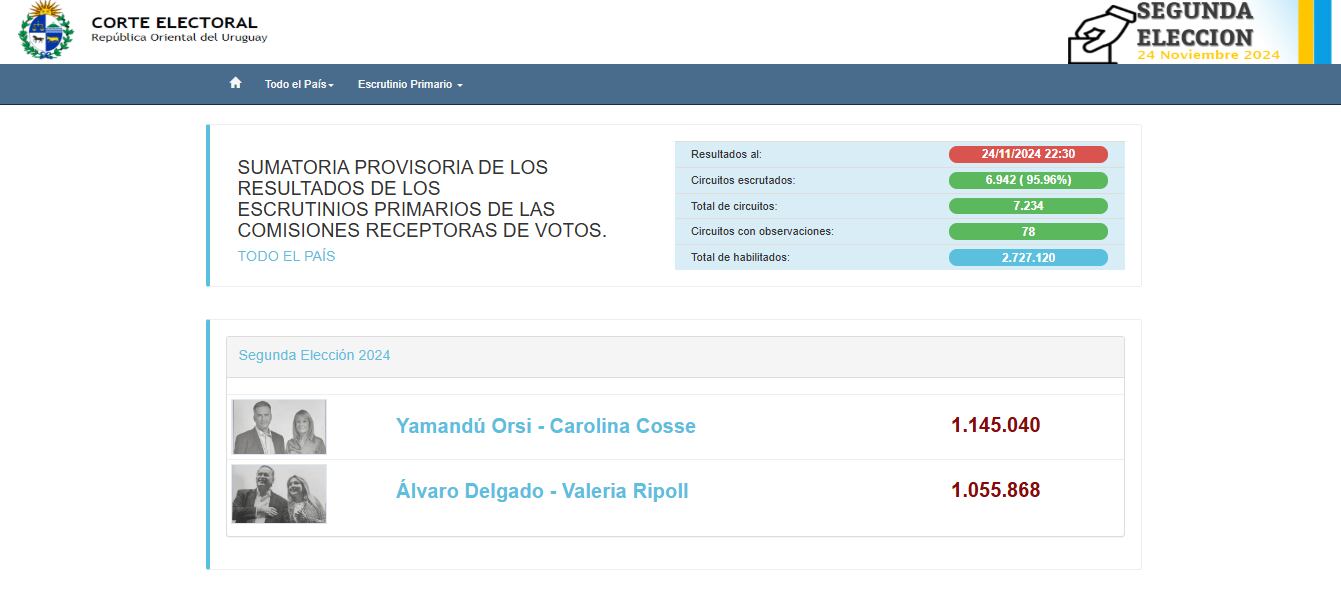 Según el conteo de votos de la Corte Electoral de Uruguay, con el 95% de los circuitos escrutados, Yamandú Orsi y Carolina Cosse obtuvieron 1.145.040 votos, frente a 1.055.868 de Álvaro Delagado y su fórmula vicepresidencial Valeria Ripoll.