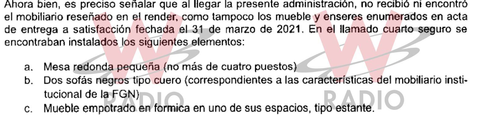 De acuerdo con la respuesta de la Fiscalía para “el cuarto seguro” del fiscal Barbosa se destinaron muebles que costaron 76.536.040 pesos y que incluyen: