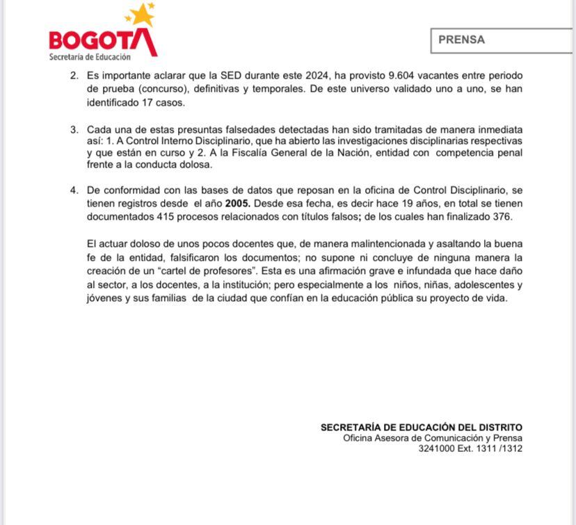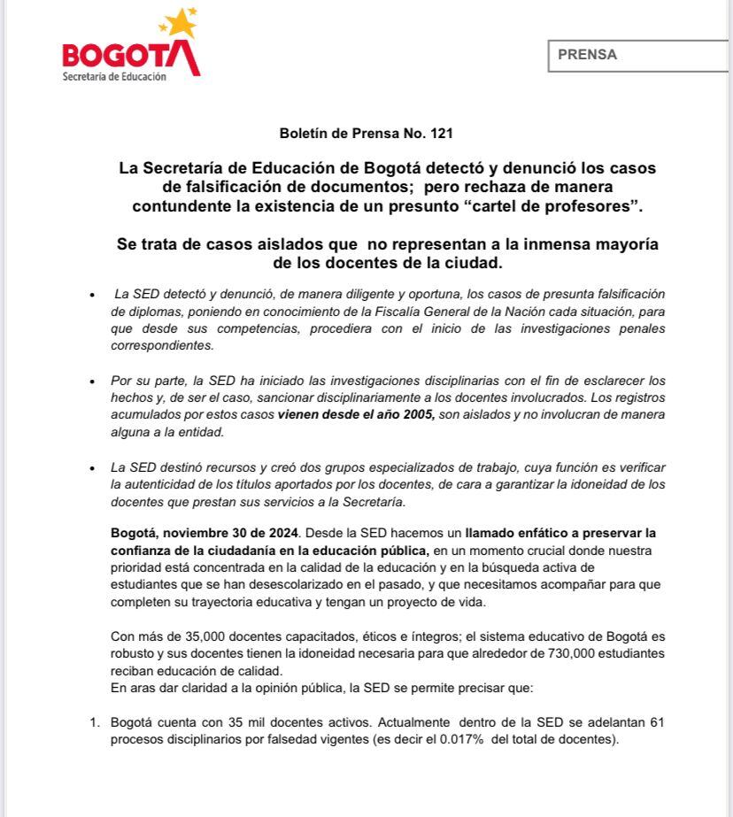 Mediante un comunicado, la Alcaldía de Bogotá a través de la Secretaría de Educación aseguran que estos casos fueron denunciados en su momento, pero que no se trata de un “Cartel de Profesores”.